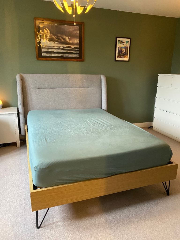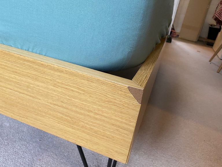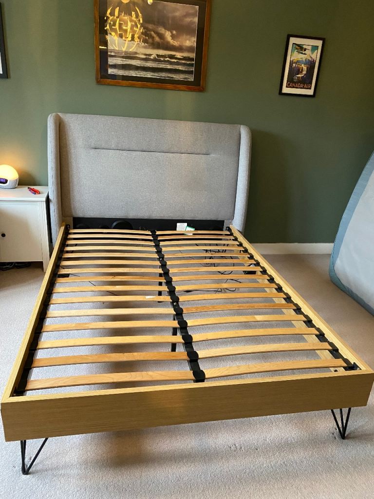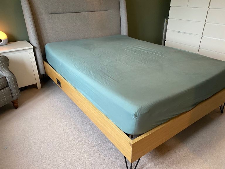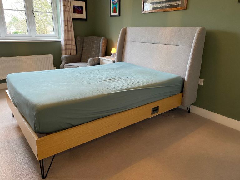 Headboard include speakers that connect to Bluetooth, two motion sensing lights on either side, with wireless phone chargers with USB if needed , only slight damage is at the end left side where a piece of the outside has come off. From a pet and smoke free home open to sensible offers