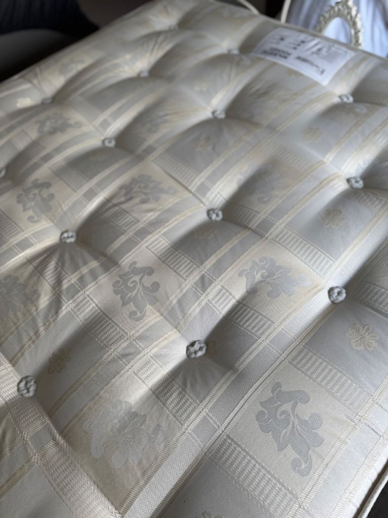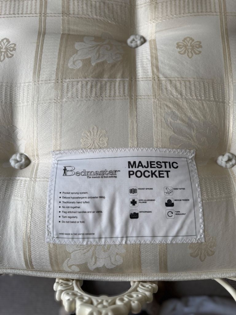The bed comes with a less than one year old support mattress (immaculate condition) which has 1000 pocket springs and measures 135 x 190cm. It is medium firmness and has been a spare room bed, very rarely slept in and always with a mattress protector.
