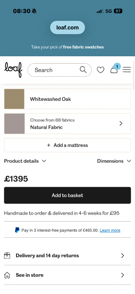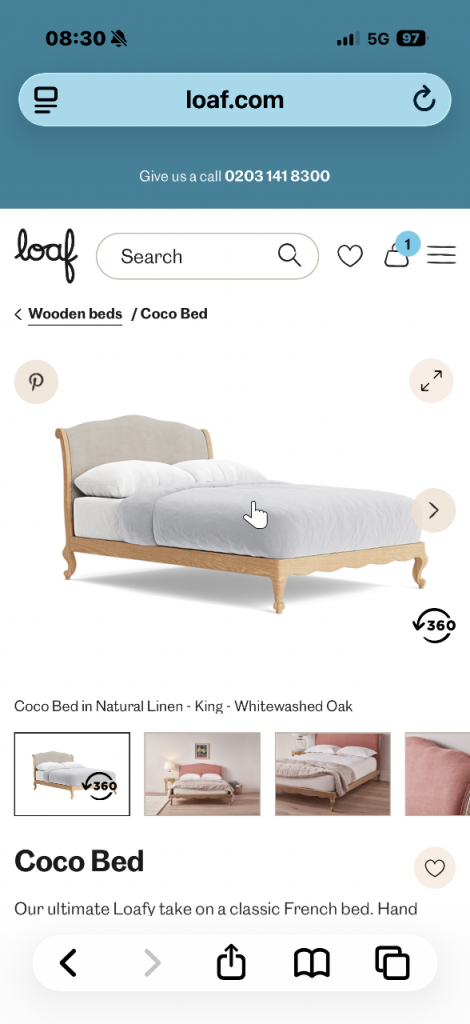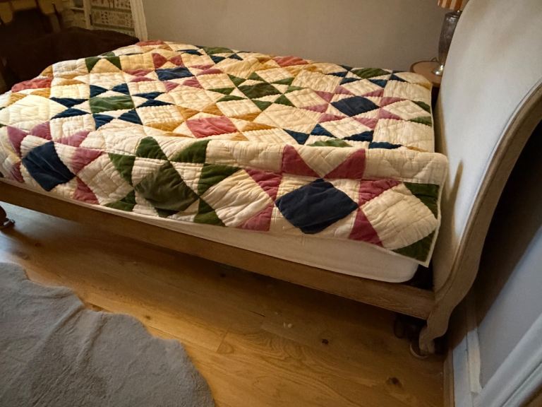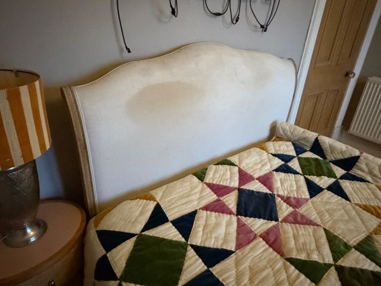 This stunning solid wooden bed frame is up for grabs as we're upgrading to a super king size. The headboard needs a fair bit of TLC - either a good clean or reupholstering. The frame itself is very sturdy and unmarked and boasts a beautiful, elegant French chic design.
