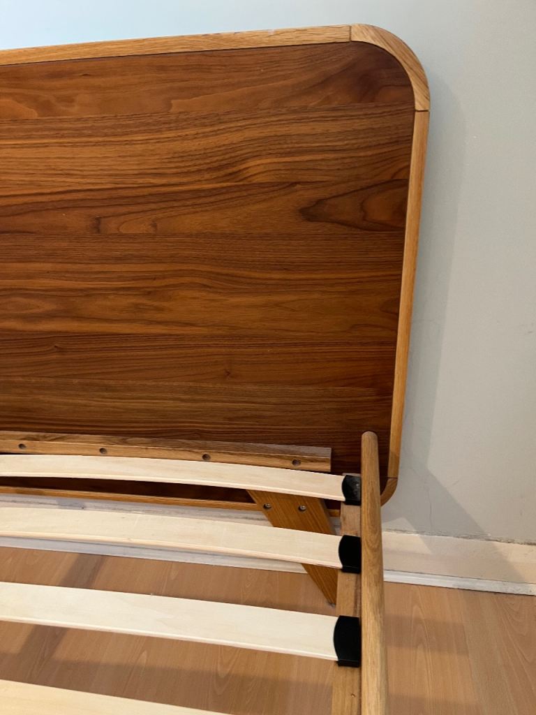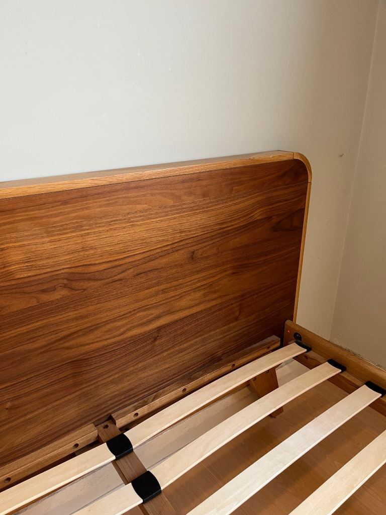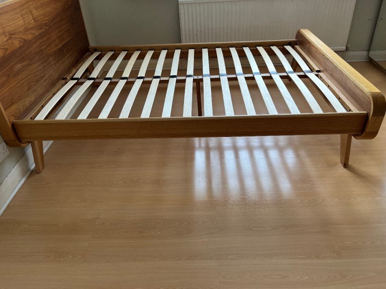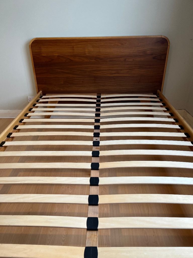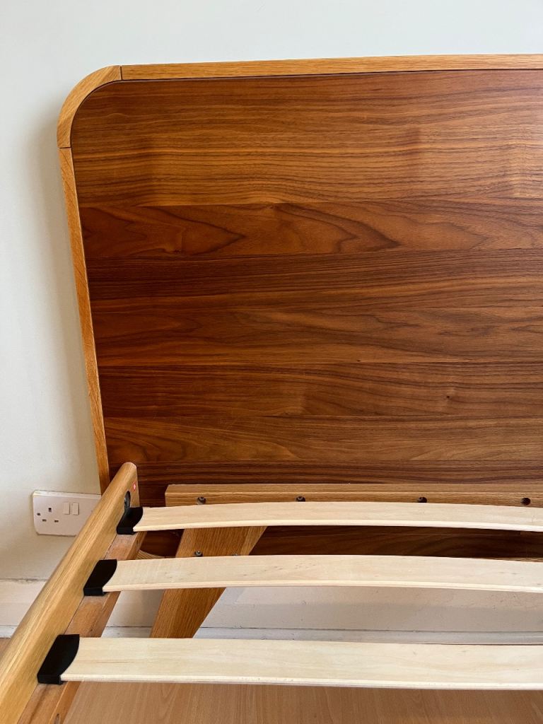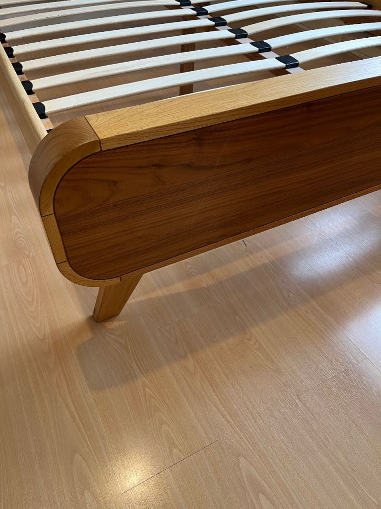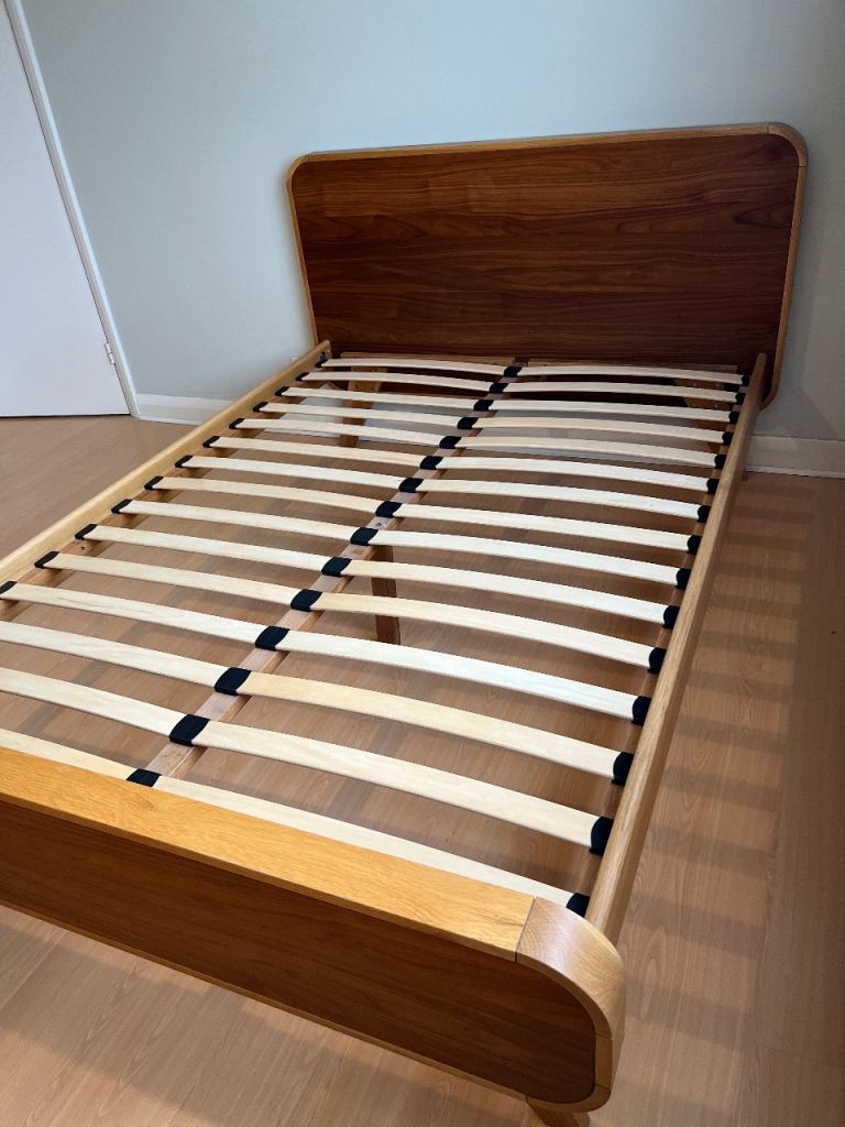 Double (140 cm x 200 cm) oak and walnut bed frame in very good condition from Made. The bed is solid and sturdy. One missing slat holder (bottom left). Bed frame has been dissembled. Collection only from Taplow, Maidenhead.