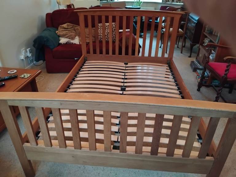 Solid oak bed frame. Total length is 200cm, total width is 158 cm, takes standard double mattress. Headboard height is 101 cm, footboard height is 78 cm. These are close estimates.