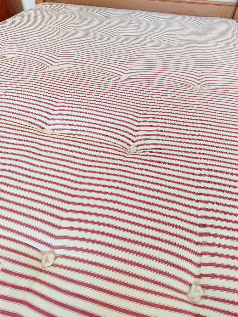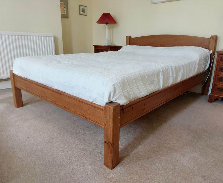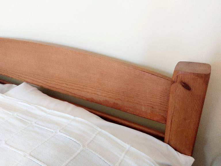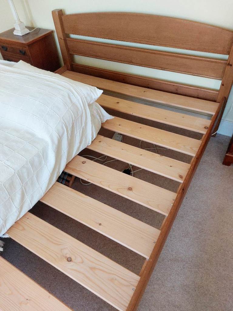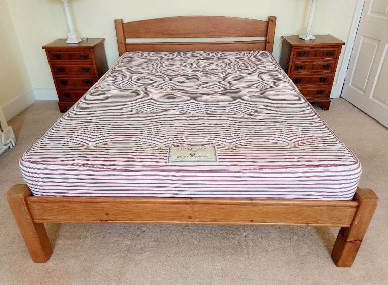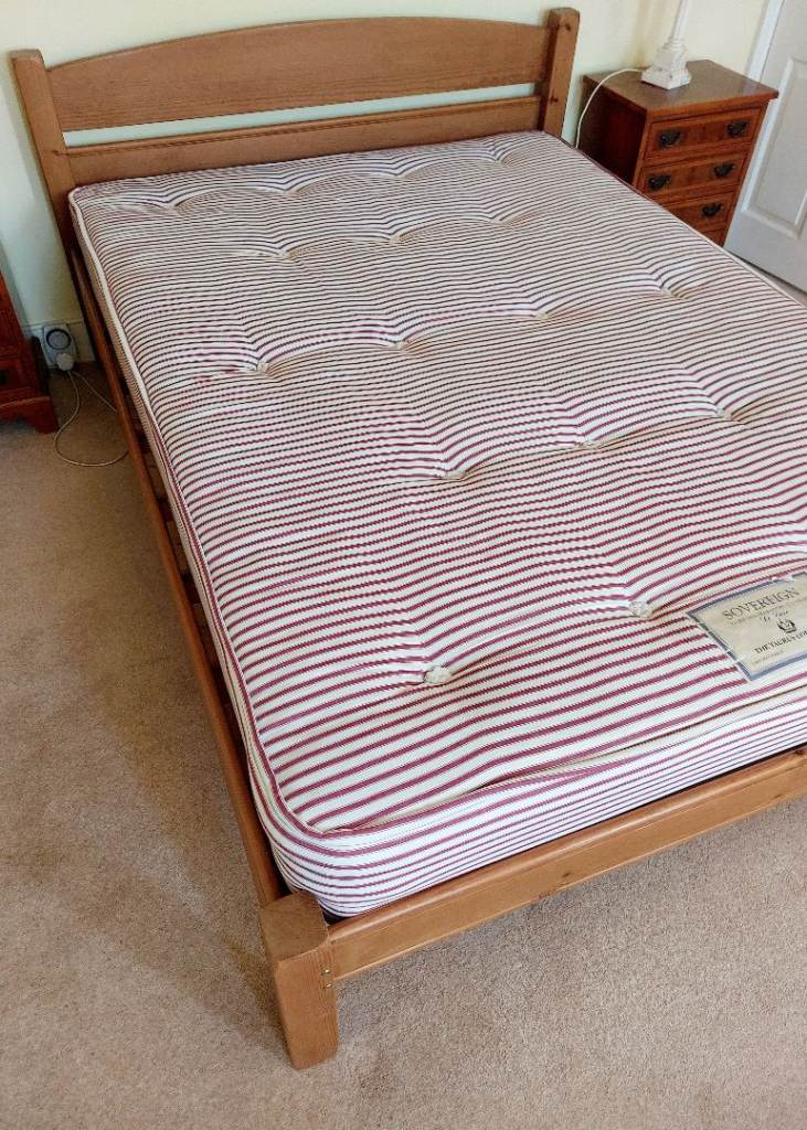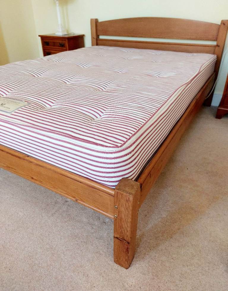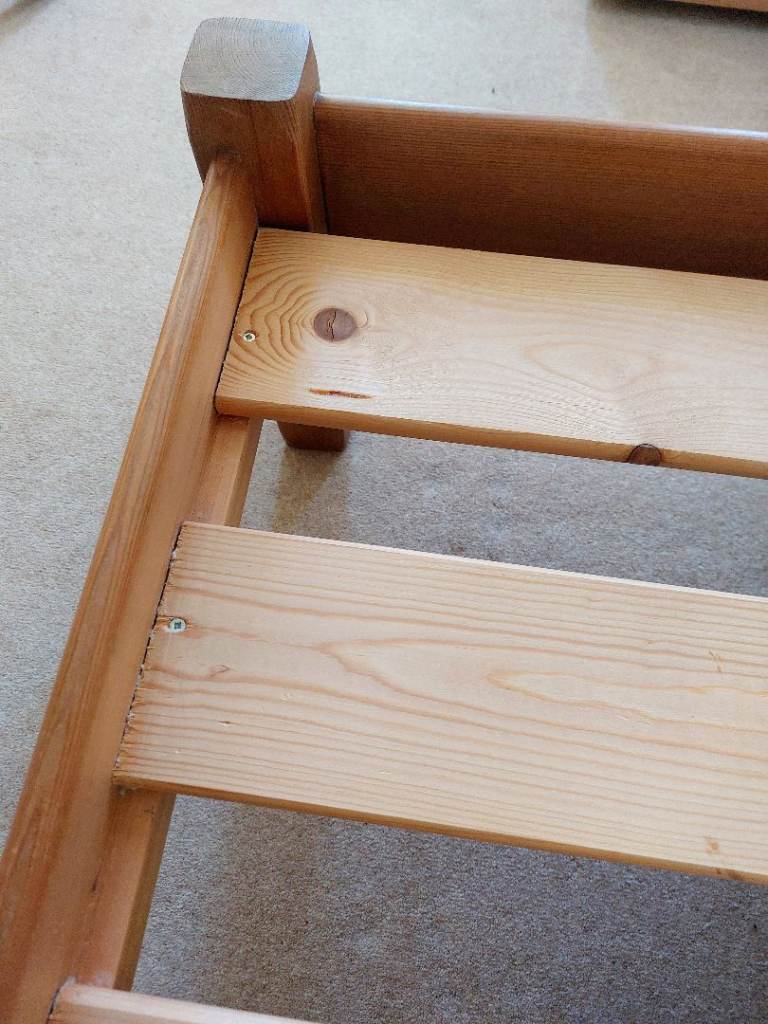 Well made, really solid with strong pine slats. Mattress in v good condition, no stains.