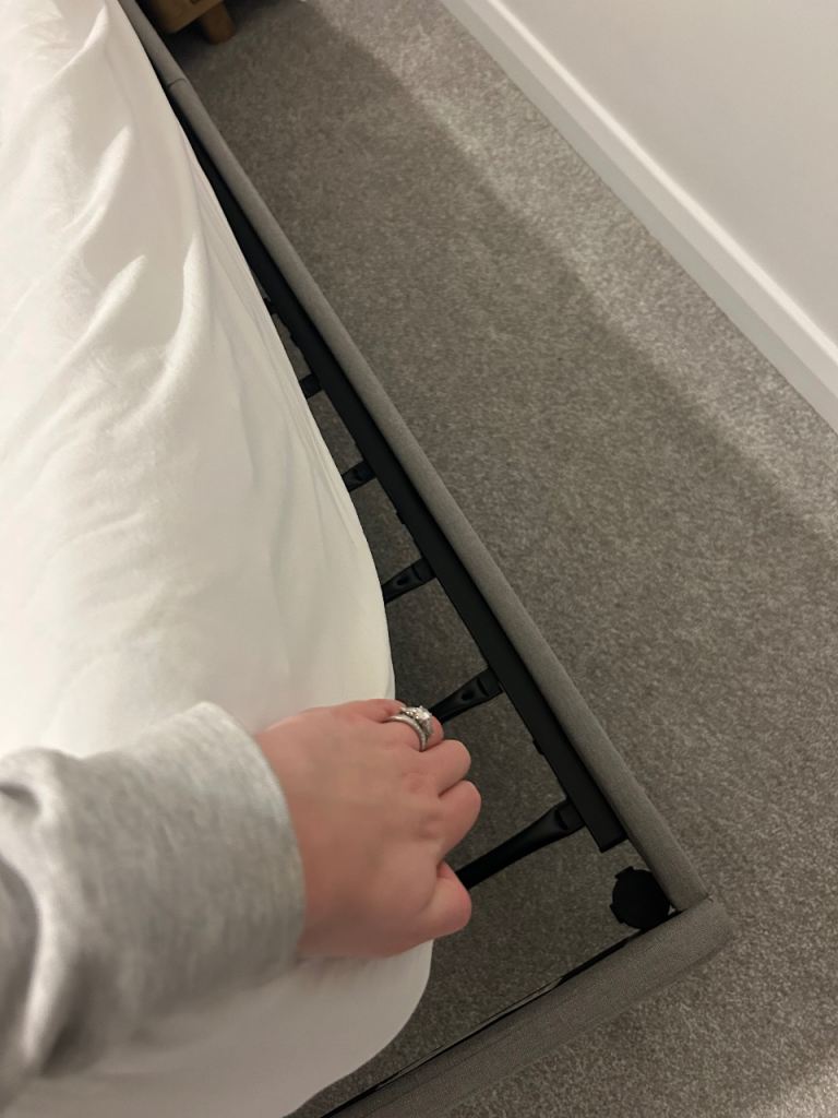 Grey upholstered bed board. Metal pole base. Space under bed for storage.