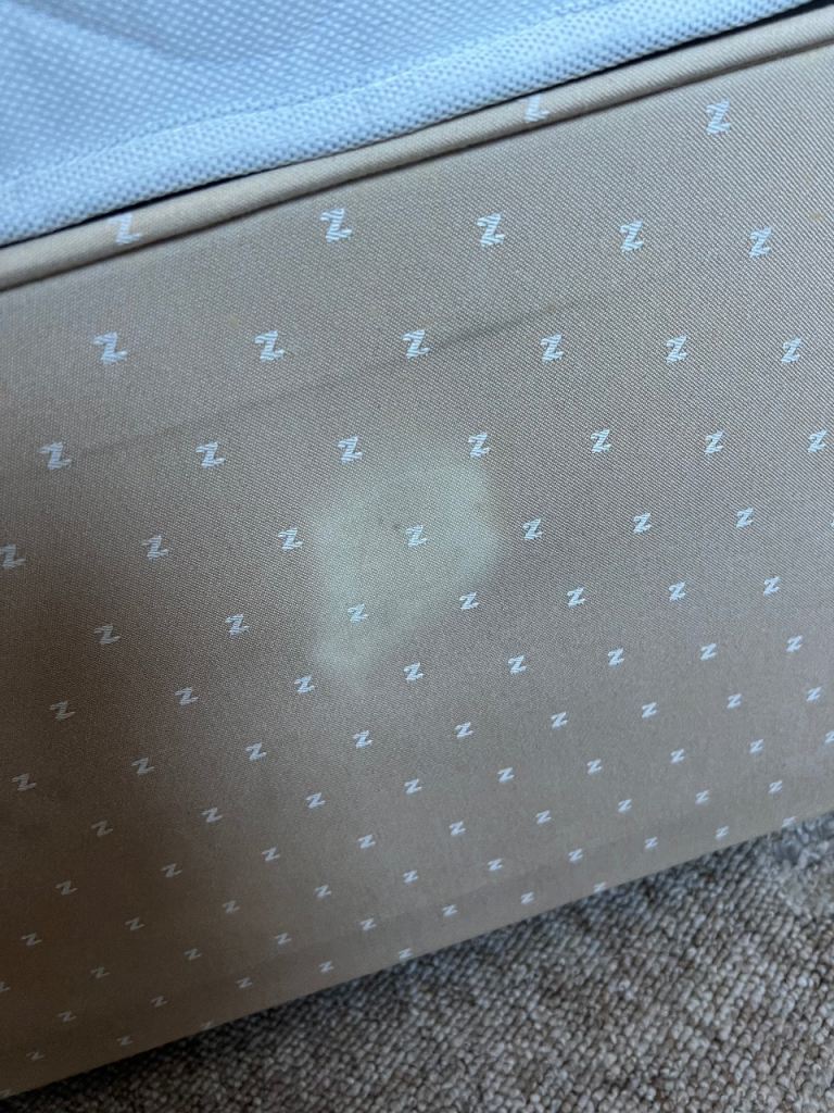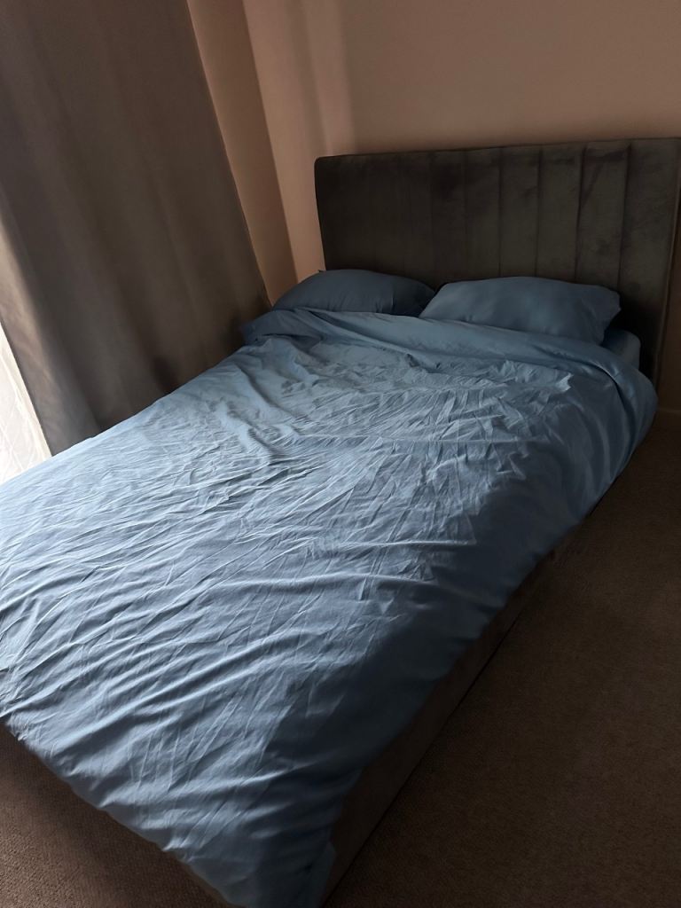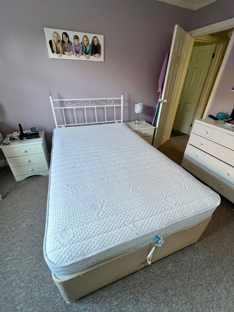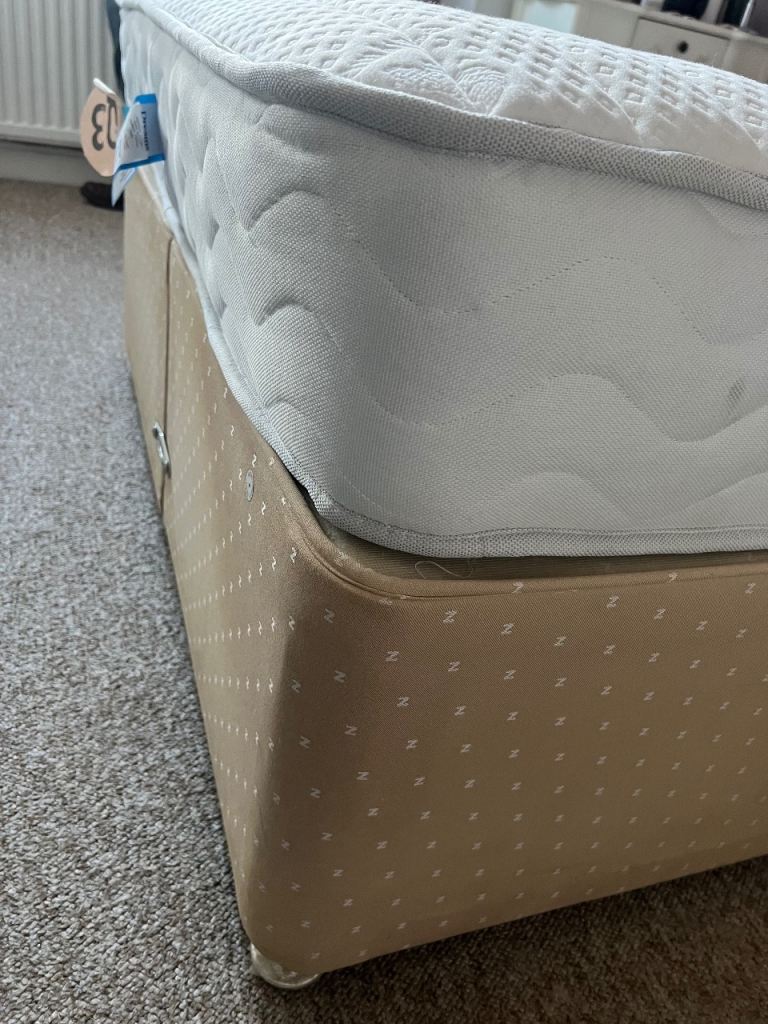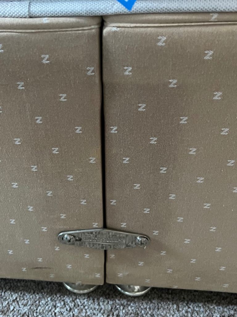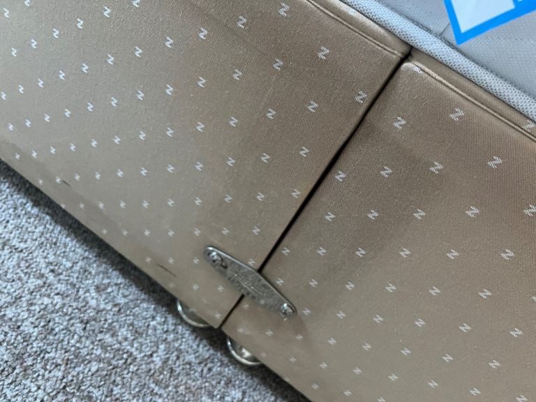 4’ double divan base x 6’3” length which splits for easy transport. Small mark on side near headboard.