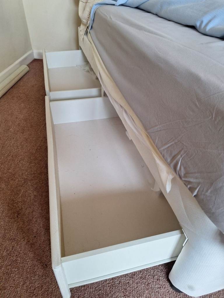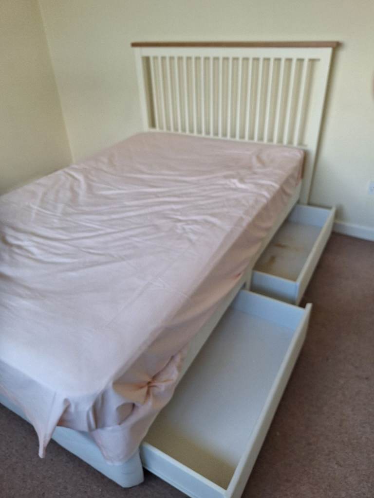 Pretty Cotswold Company four foot small double bed, plus excellent quality Silent night mattress. The bed has cream head-board, and four storage drawers, 2 on each side. £60 ono.