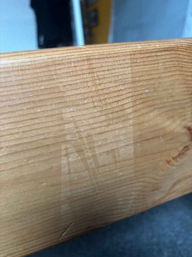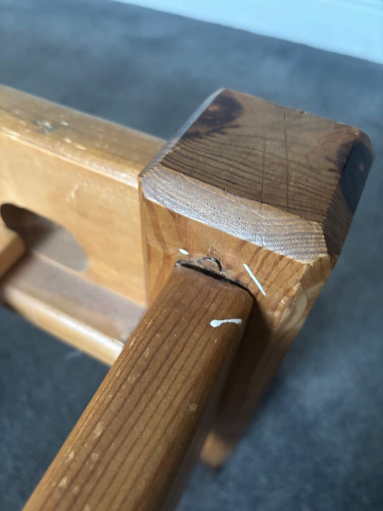 As you can see the photos as well using well loved. There are some cosmetic marks from tape on the wood when I moved and paint when I wasn’t careful. I found the middle bar bowed a bit so I bought a two short extra leg to place in the middle, which is propped up by a few bits of wood. But it would be a quick swap to one of the correct length.