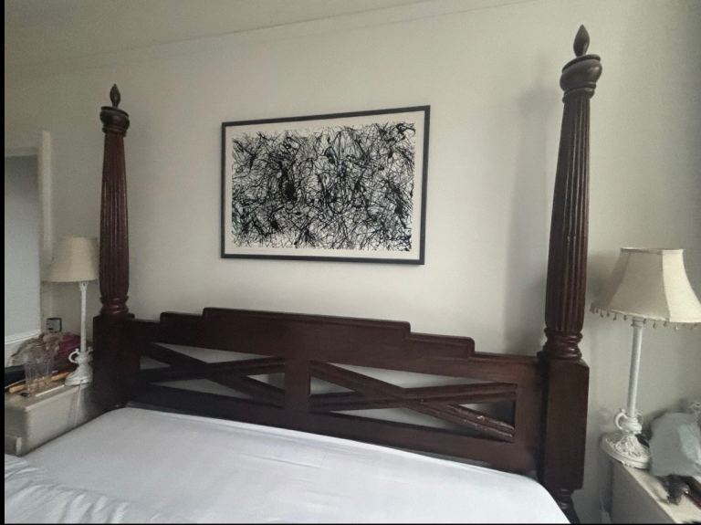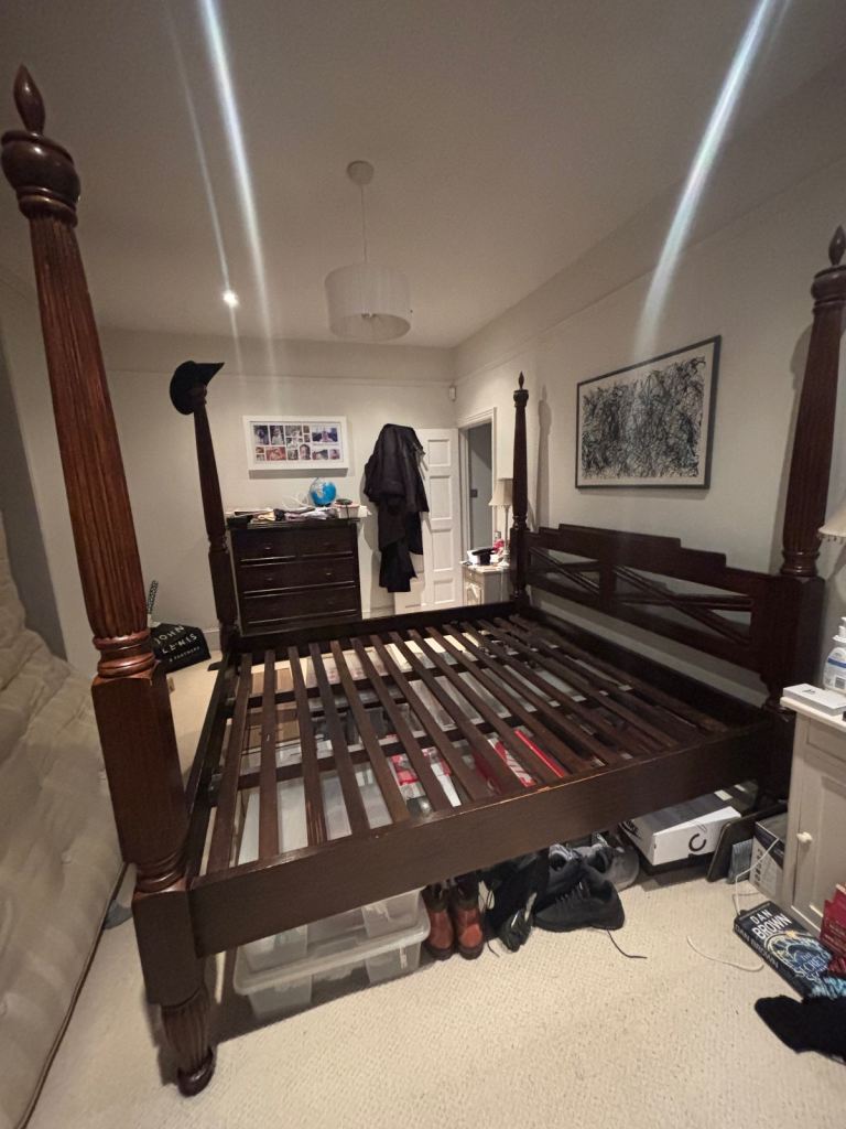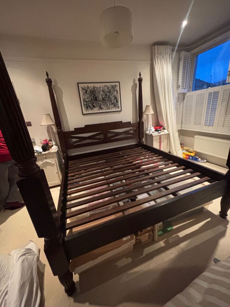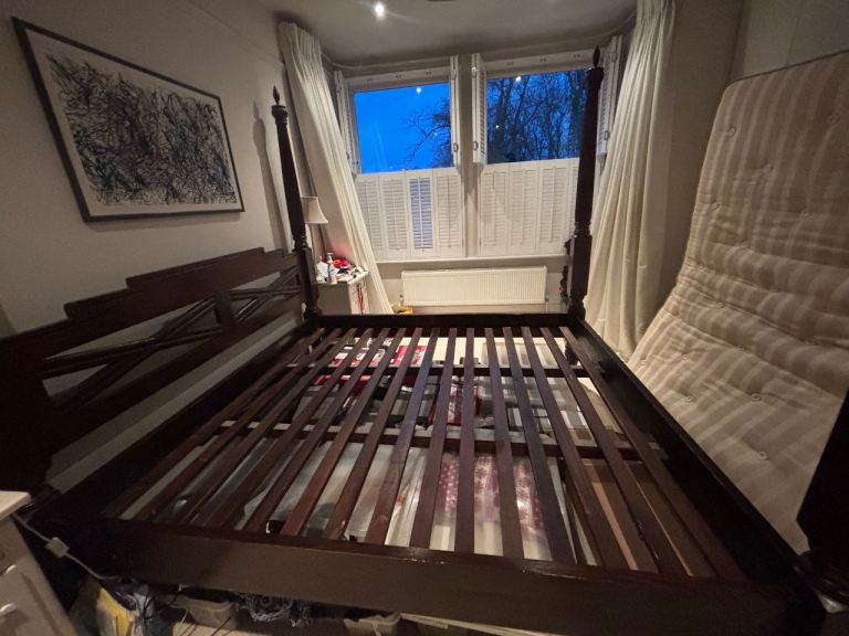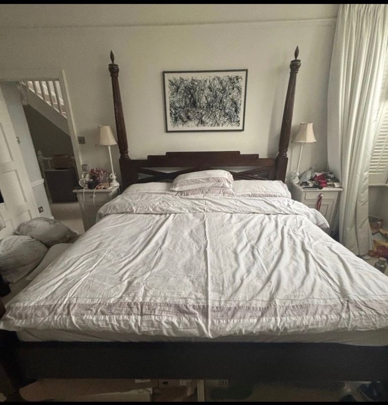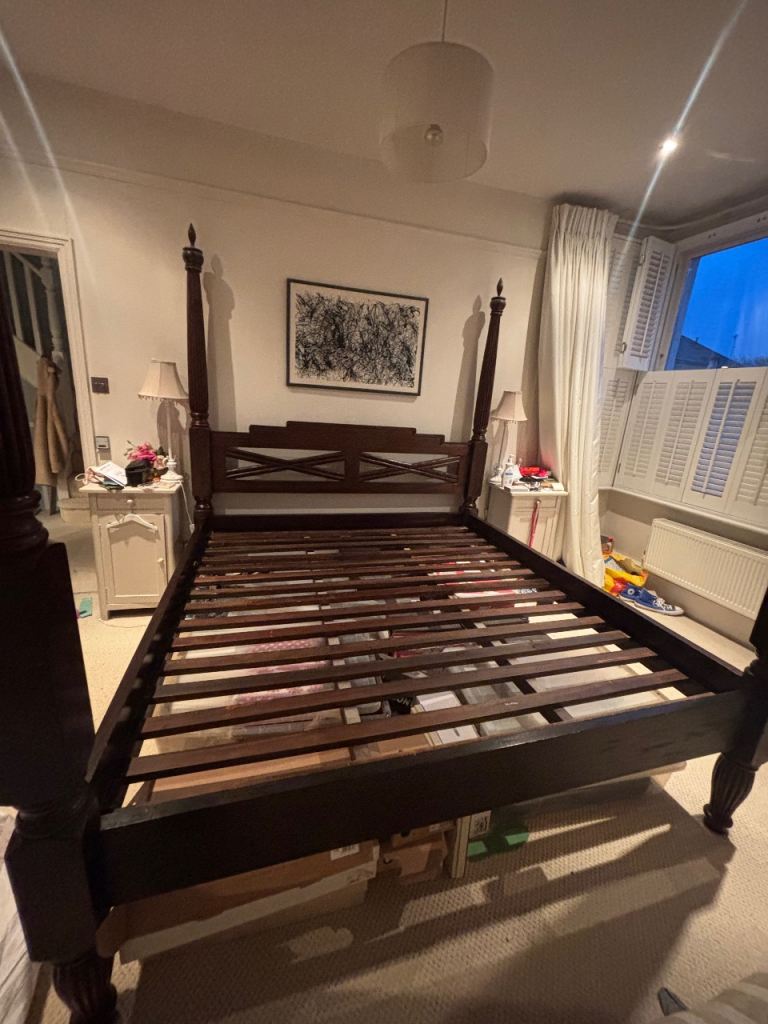 A super king sized 4 poster bed in solid teak by Lombok. Comes with or without the mattress and has all the parts (currently stored away). One owner in a pet free and non-smoking home. Redecorating so changing the vibe in the home.