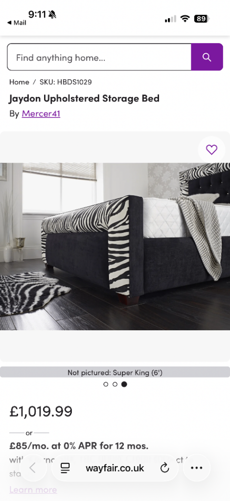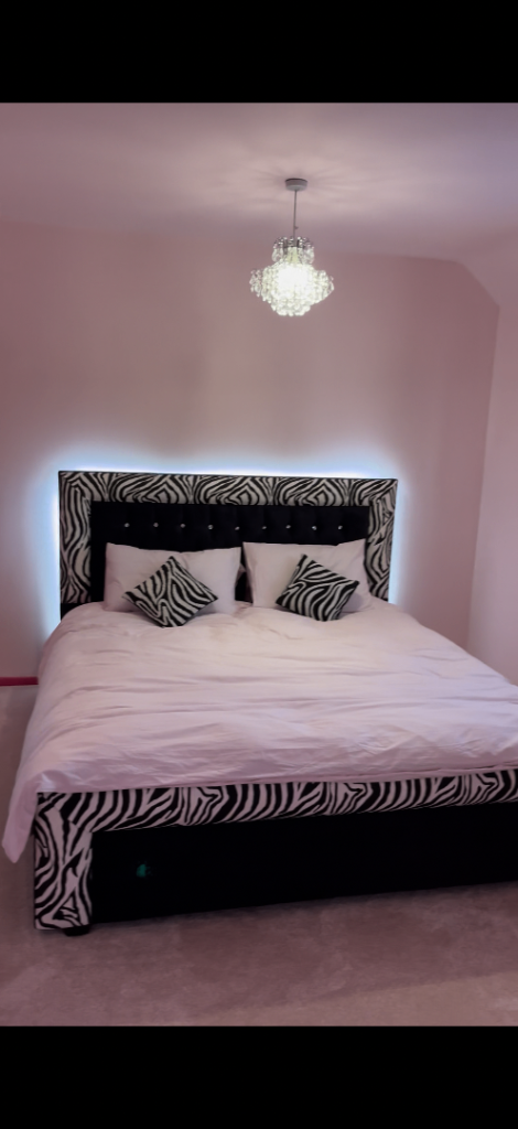 Super King bed frame with black velvet, zebra print faux leather and diamanté studs.