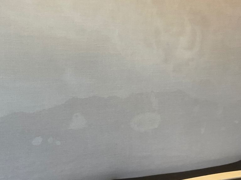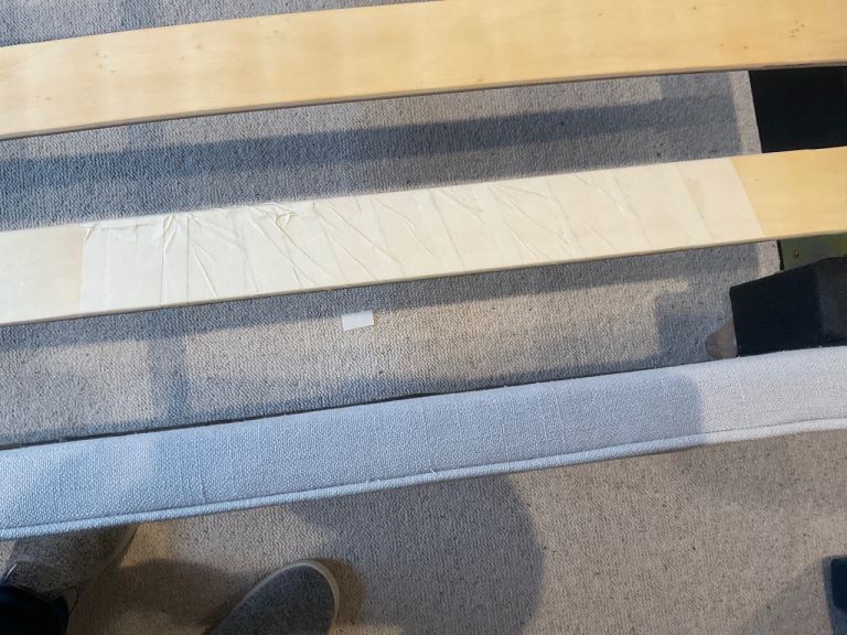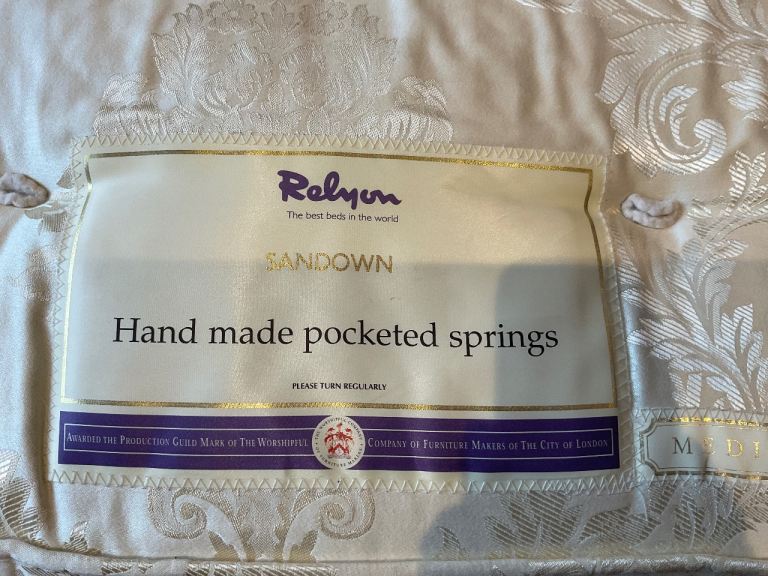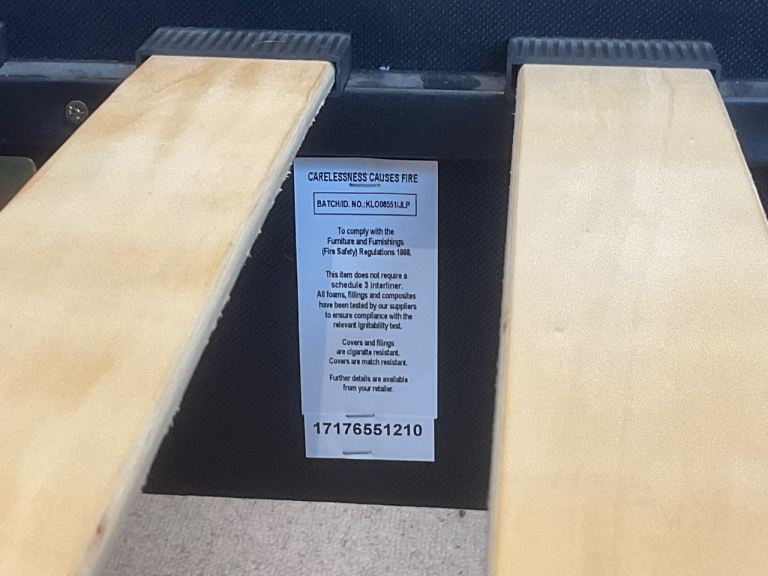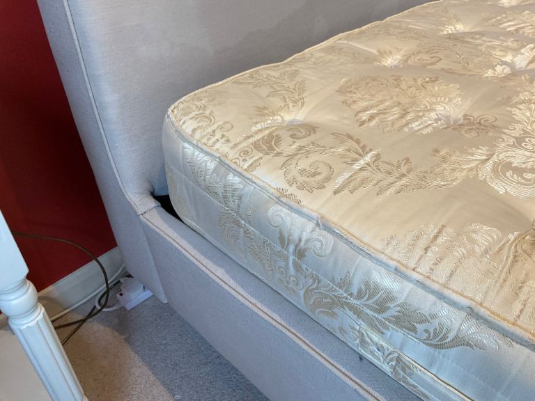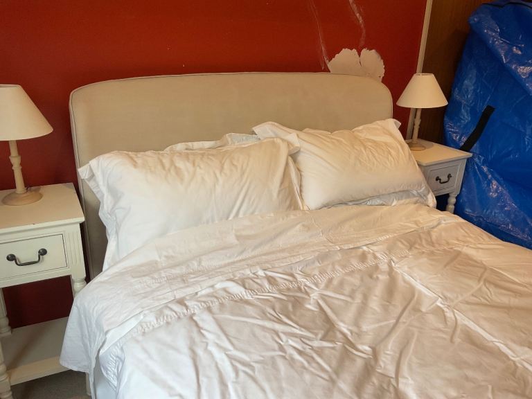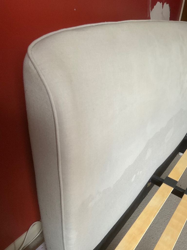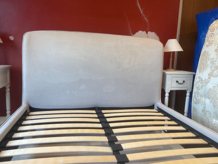 Bought from John Lewis. Upholstered double bed on turned legs. There is a bit of fading and water marks (wet hair when going to bed!!) on the head board but they don’t show when the bed is made up. One of the slats is slightly spilt, but still in one piece, I taped it to ensure it remained intact. The mattress can be included for an extra £25.