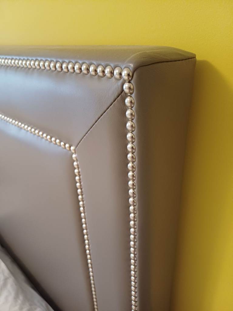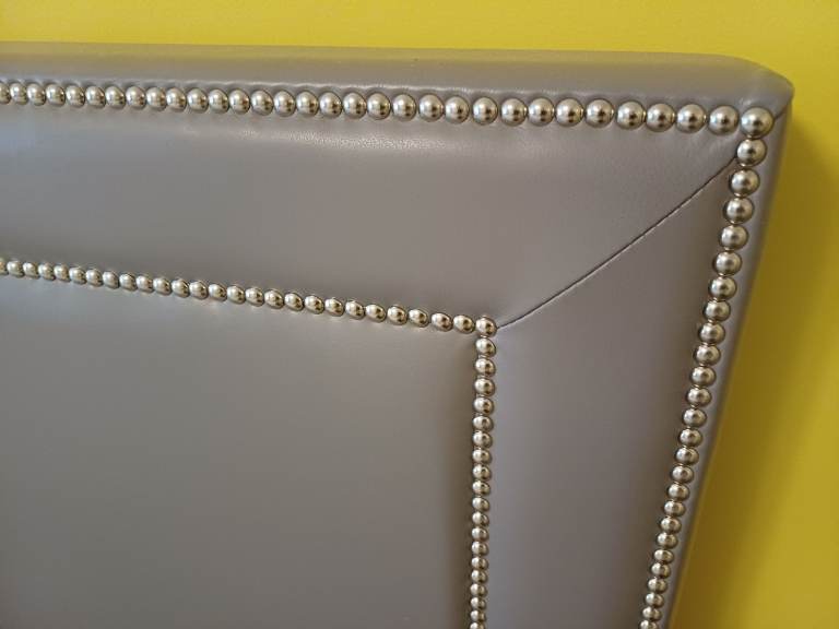A floor-standing headboard with a double row of studs, designed to be the perfect focal point. Its bold, refined presence adds impact, elegance, and luxury to your room. In soft grey leather (Big Bed Company “Lena Fossil”).