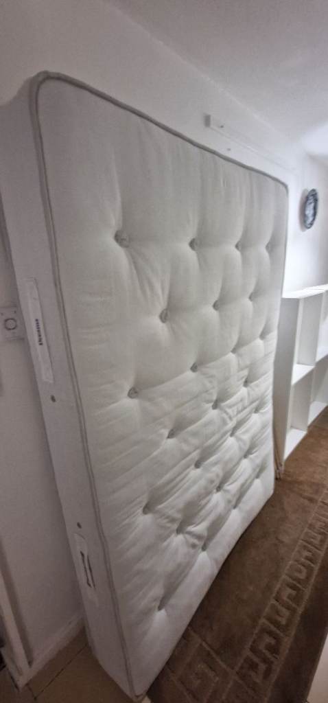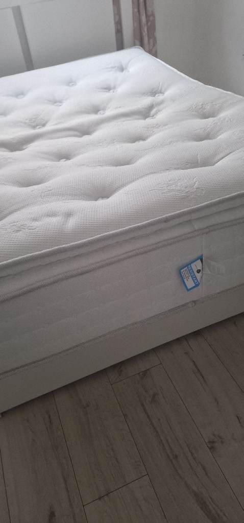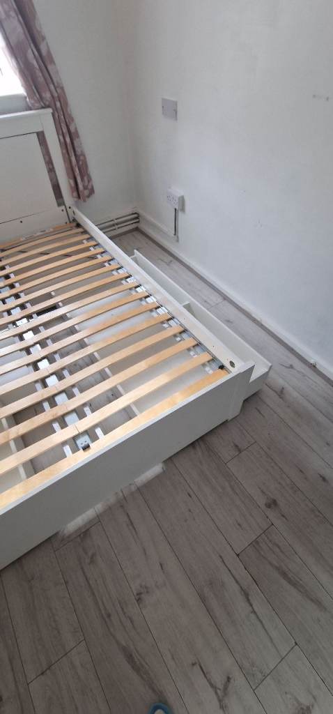 The product is a white double bed with a mattress and headboard . It is a bed frame made of wood with 4 droweres from ikea , with a double-sized mattress from dreams . This stylish and functional furniture piece provides a comfortable and inviting space for a good night's sleep.