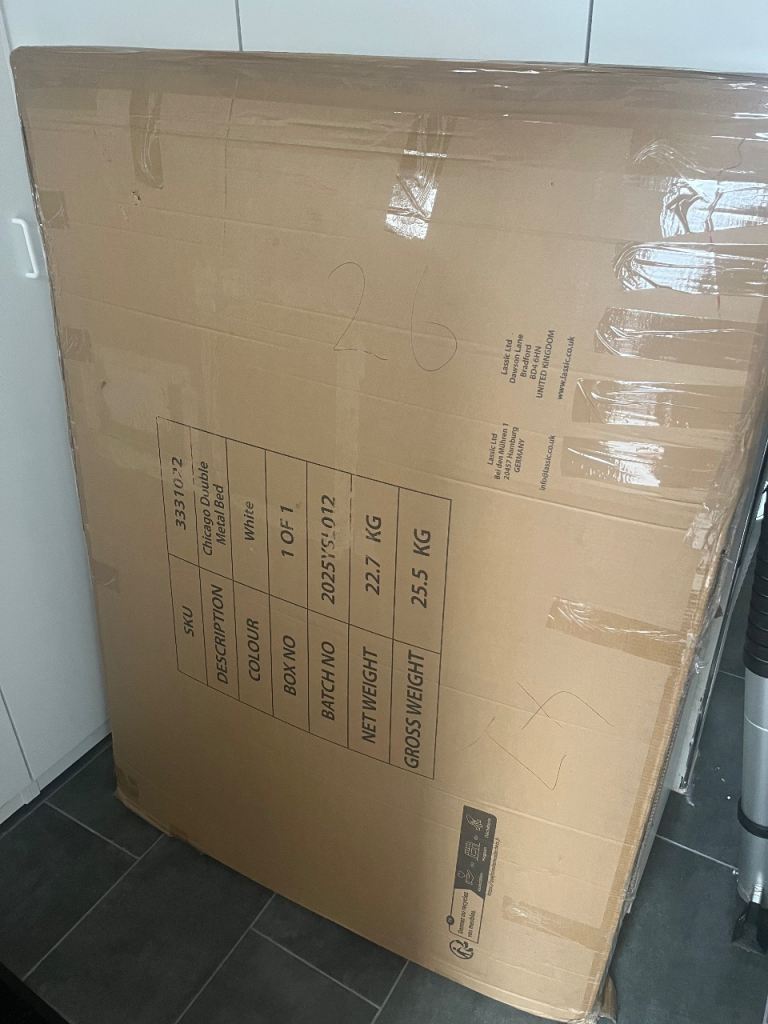 Double Bed, 4ft6 Bed Frame Metal Headboard High Foot End Bedroom Furniture, White, unused, still packed.