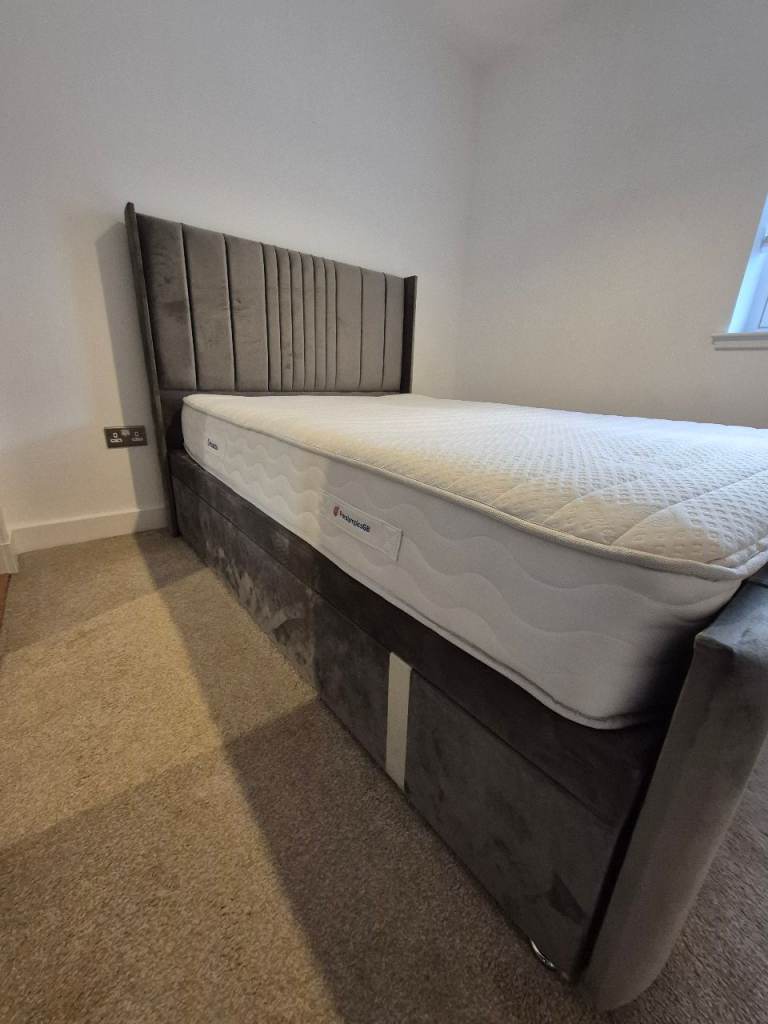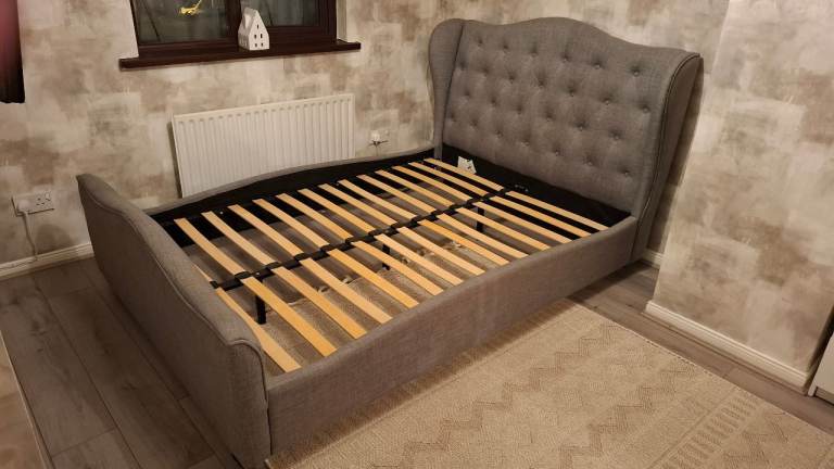 grey material wingback double bed frame like new.