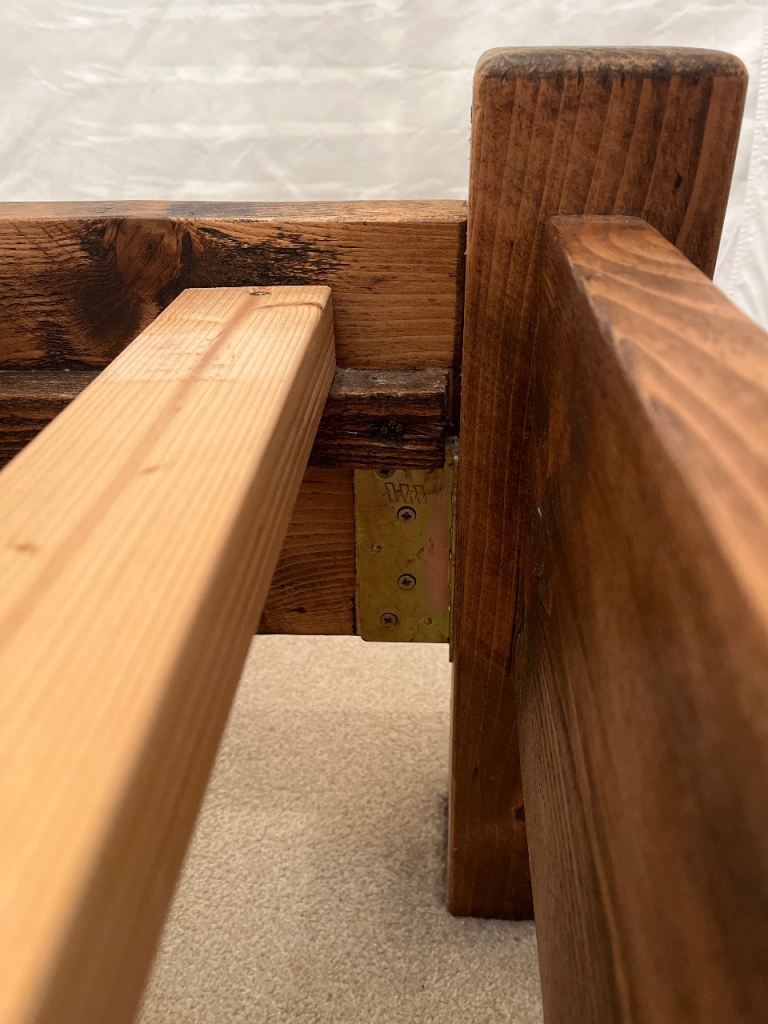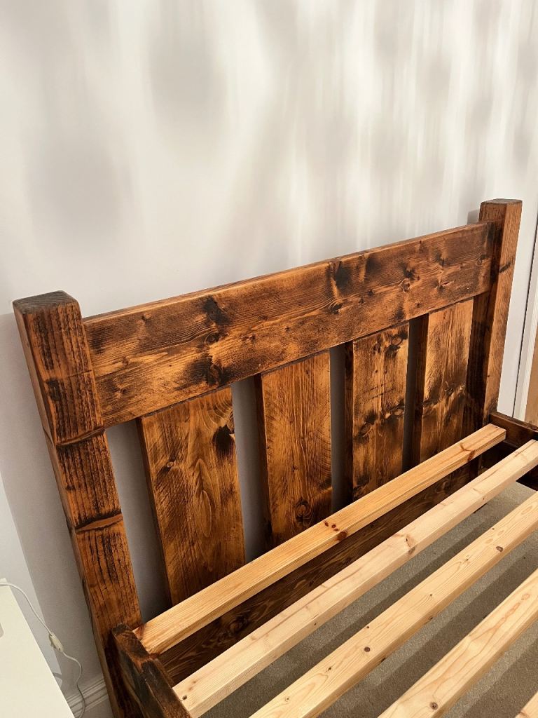 Solid wooden double bed frame made from reclaimed scaffold boards. Chunky corner posts (9cm square).