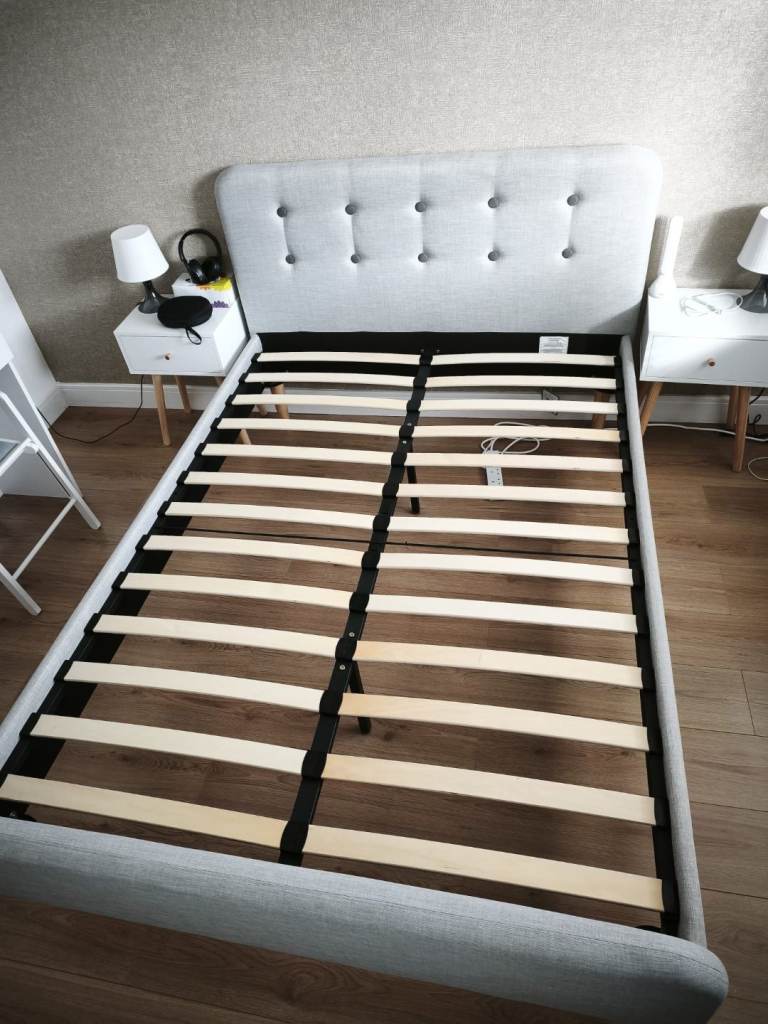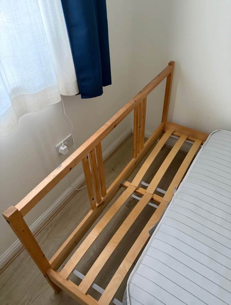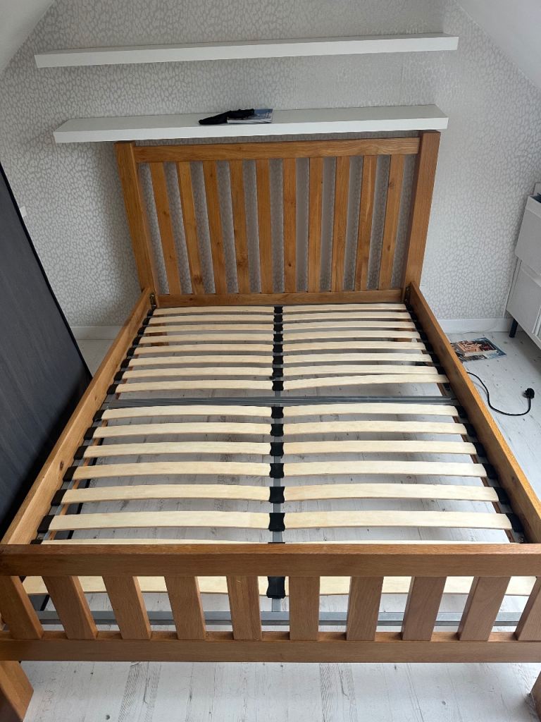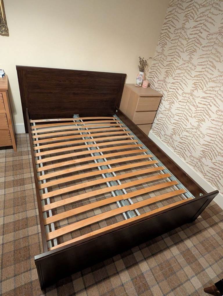 Practically new, hardly been used as only got for guest who never turned up. Just kept in the guest room ever since. Pet and smoke free home. Ikea solid pine wooden bed frame, simple sprung mattress. Standard double size. Collect from Bradley Stoke. Delivery is available too