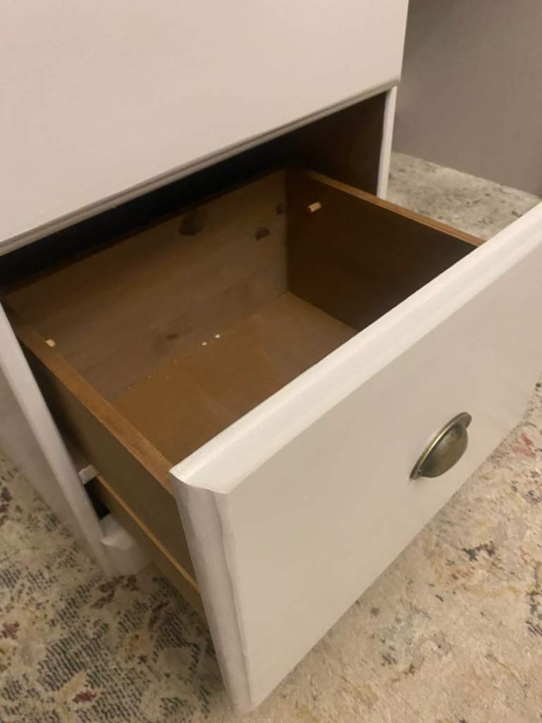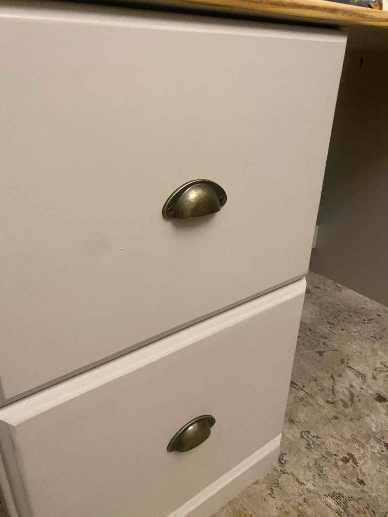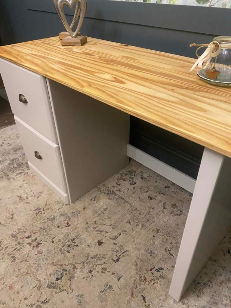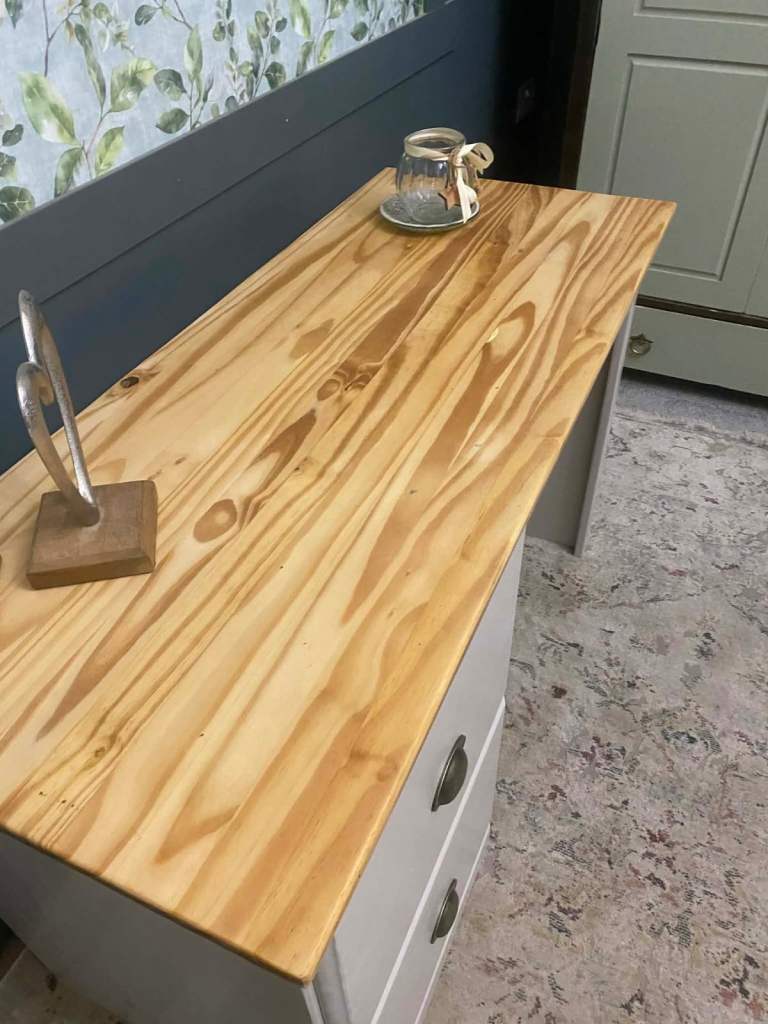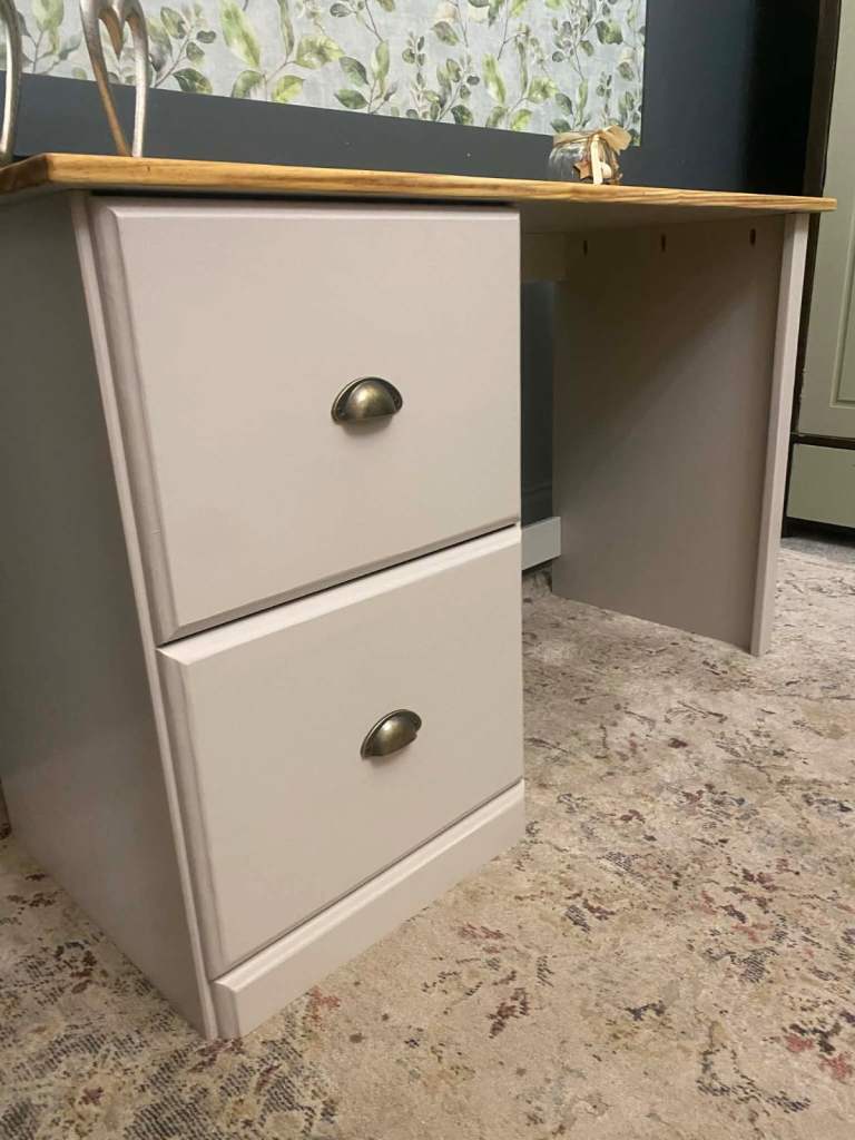 Finished in Farrow and Ball Elephants Breath with oak stained top