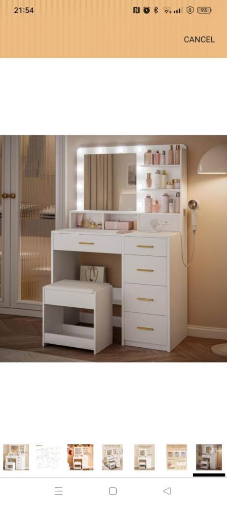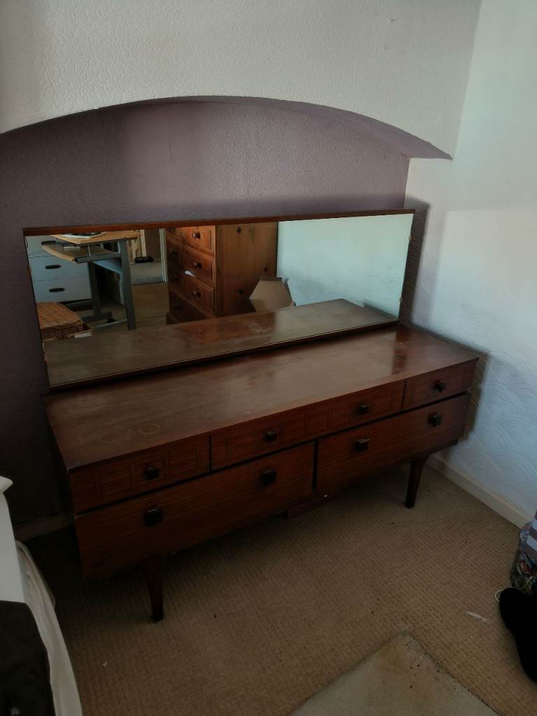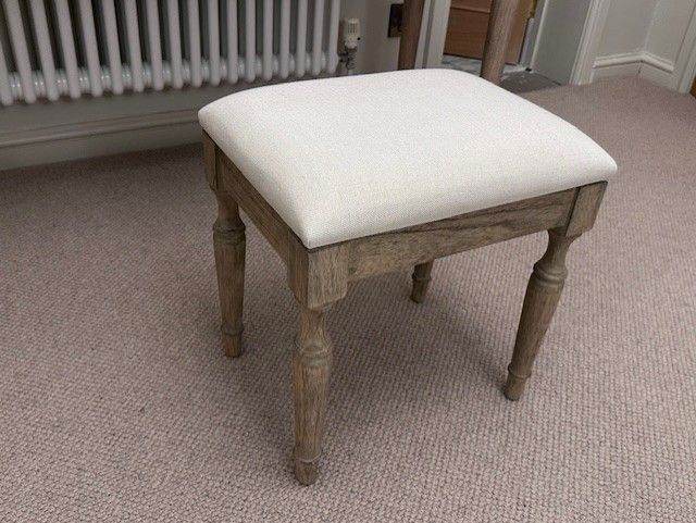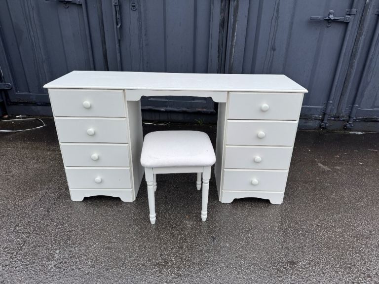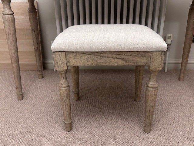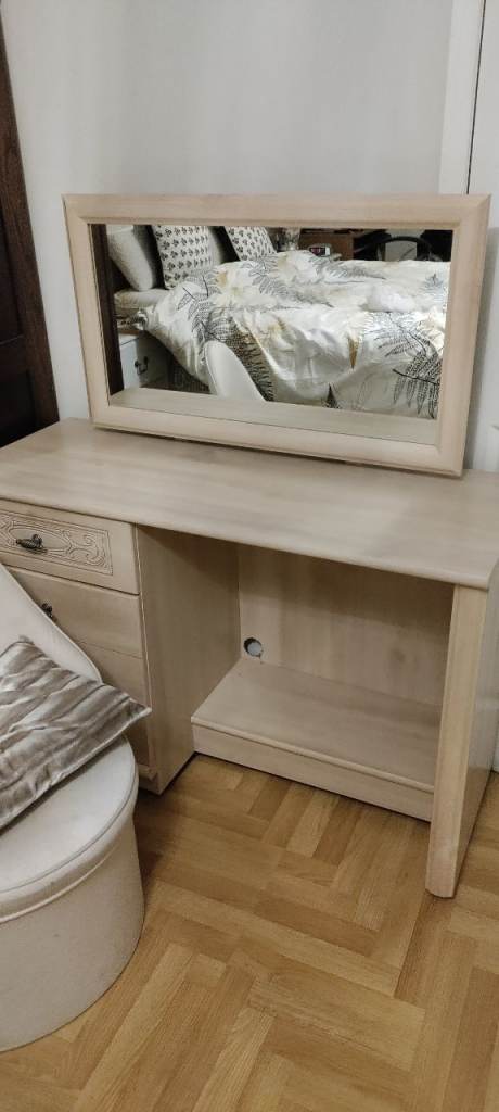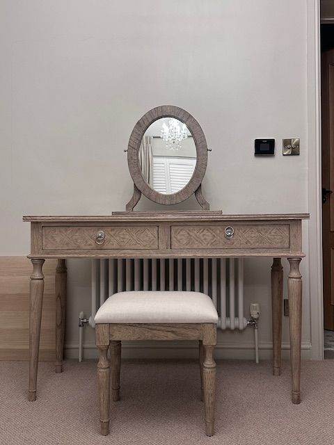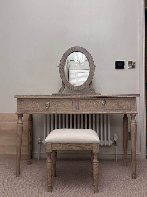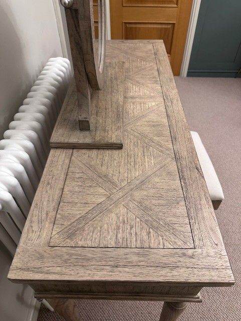 This Cox and Cox Geometric Parquet dressing table comes with a matching stool and mirror and all three items are in excellent condition. The table, stool and mirror are made from mindi wood and mahogany. The table retails at £750, the stool at £350 and mirror at £250, so total of £1350. We would like £700 for all three.