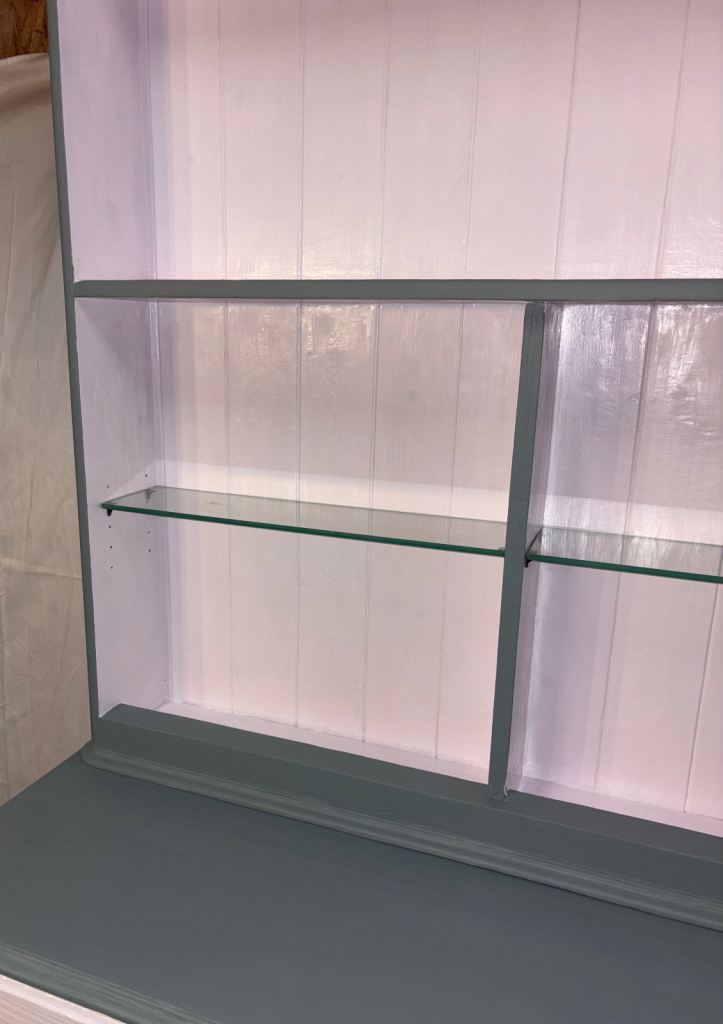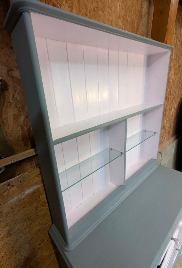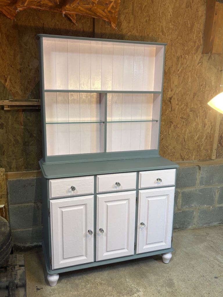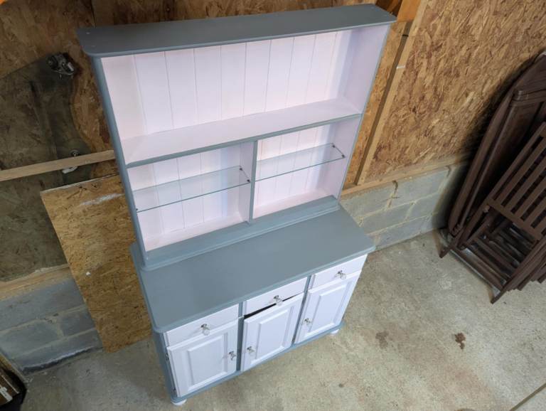 Up for sale! Quite the transformation! Newly refinished - £250 local delivery or collection 🤗 Pale pink gloss and grey unit that separates for easy transportation. Removable/adjustable glass shelves.