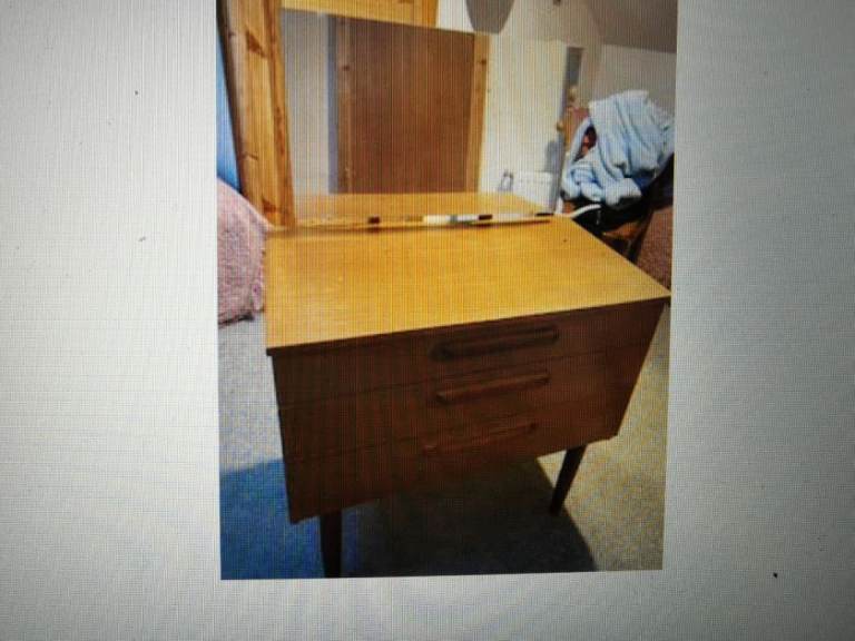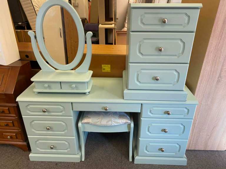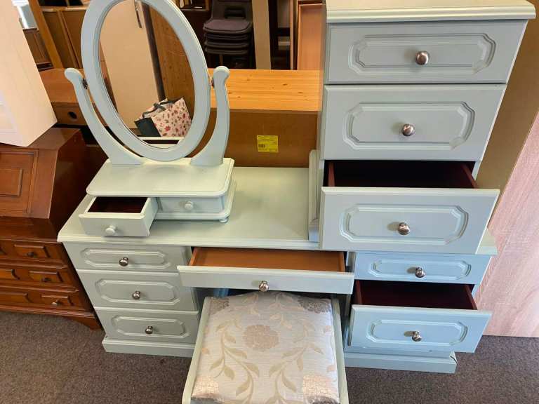 Dressing Table with stool, Vanity Mirror with drawers and small set of drawers/bedside cabinet. Painted duck egg blue. £60 for the set or will sell separately (Dressing Table £40, vanity Mirror £15, Small drawers £15). In good condition with some minor wear.