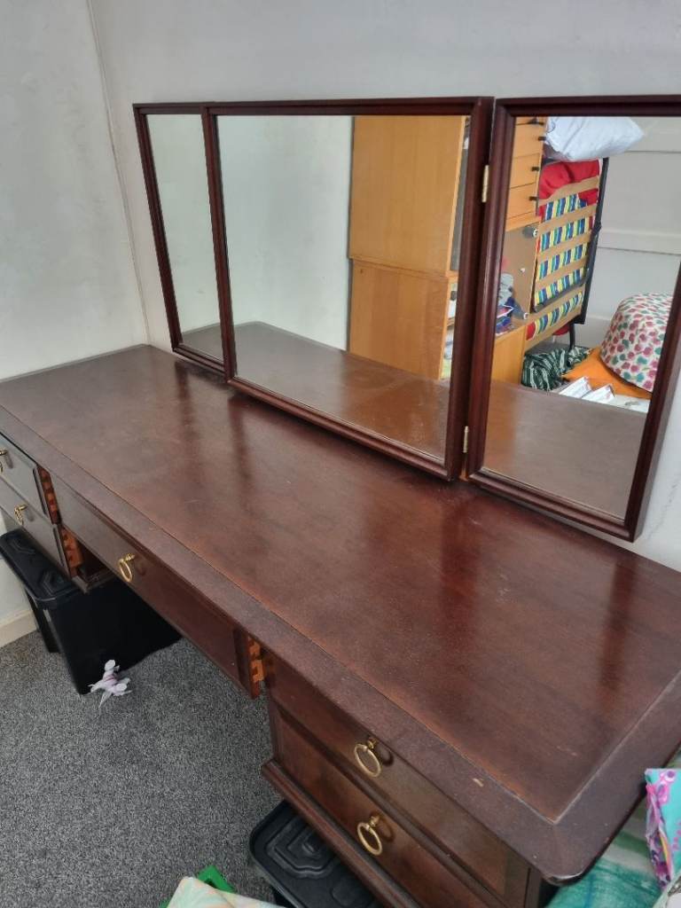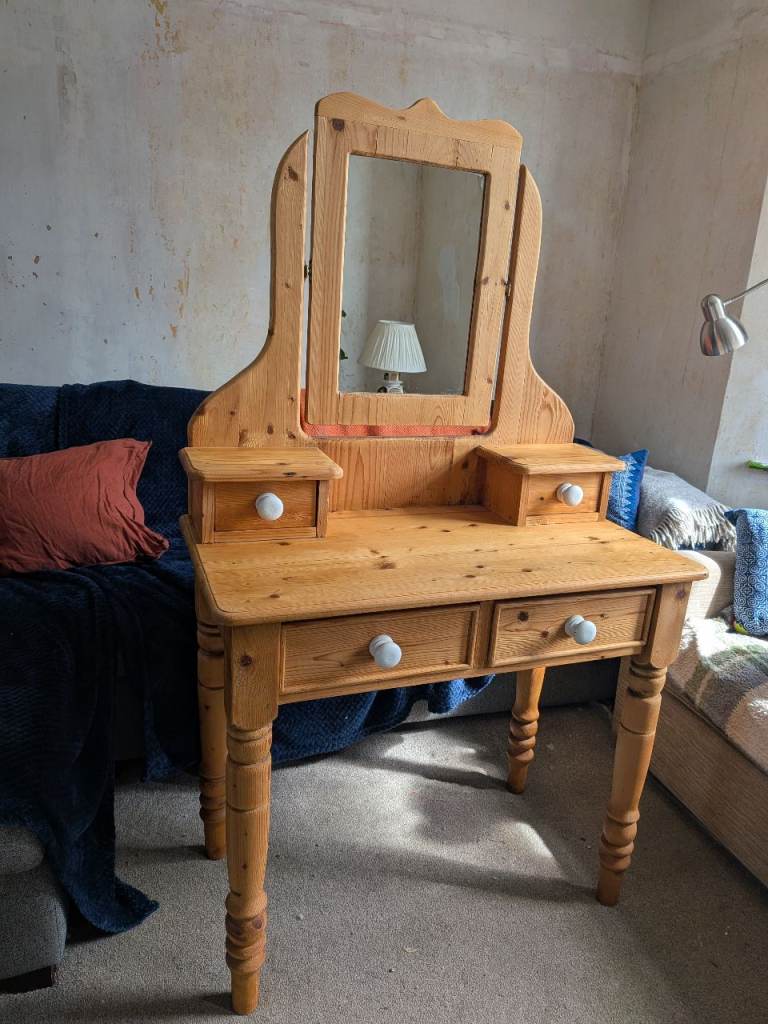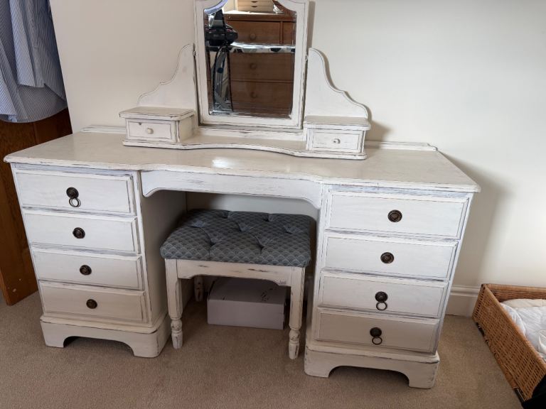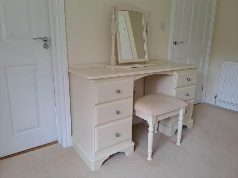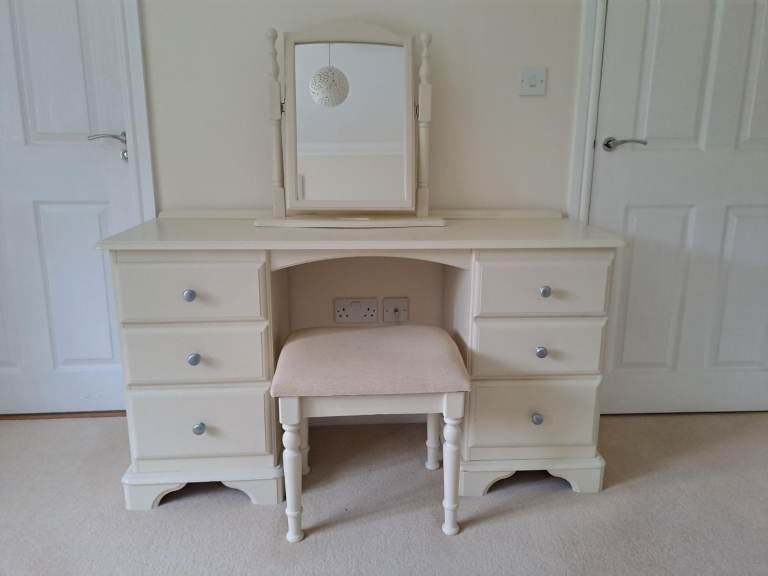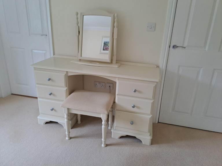 Cream painted pine well-made Dressing Table with 6 Drawers, matching Mirror and Stool.