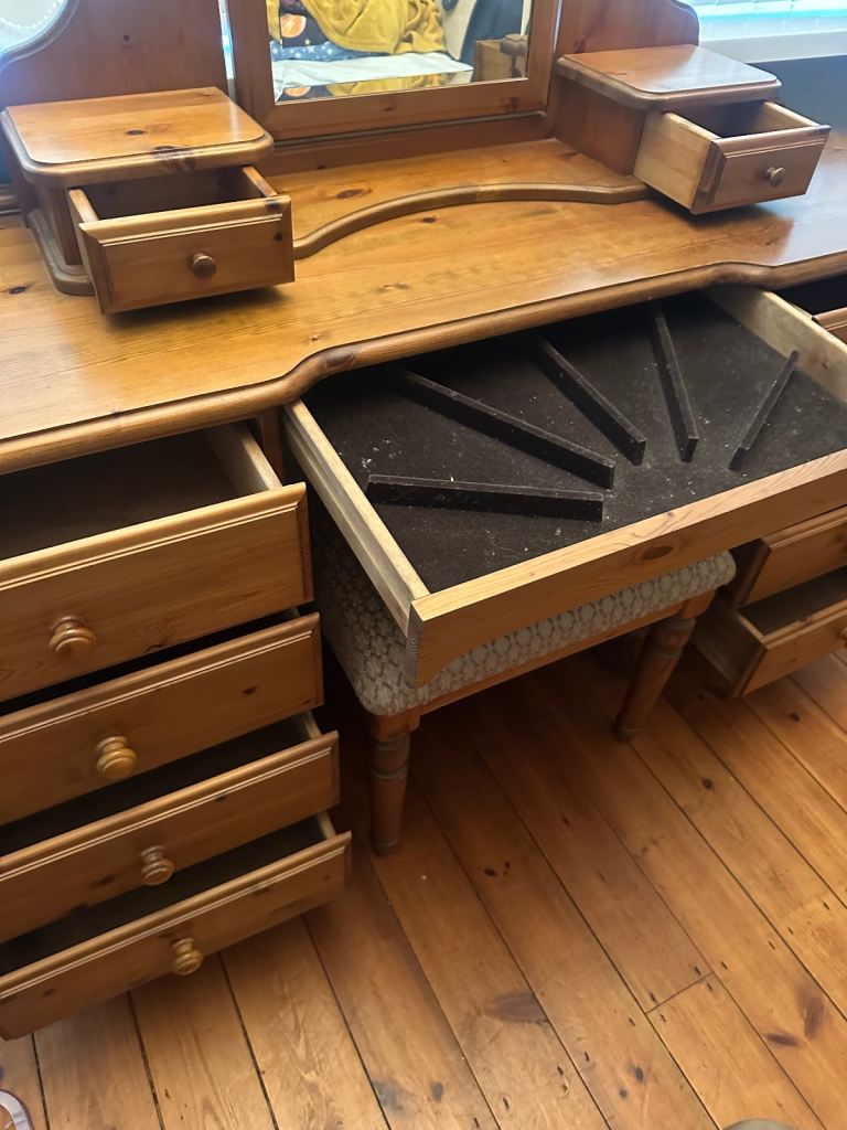 Dressing table has drawers to either side and a central hidden drawer for jewellery
