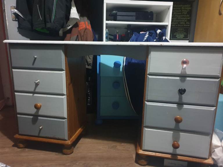 Table 100 x. 50 cms top and footprint. Height 75 cms .Drawers are 46. X. 36 cms deep and 8 cms high .