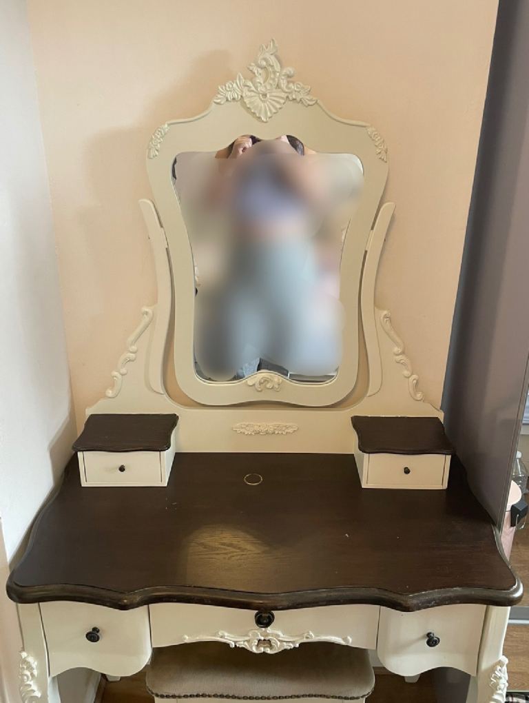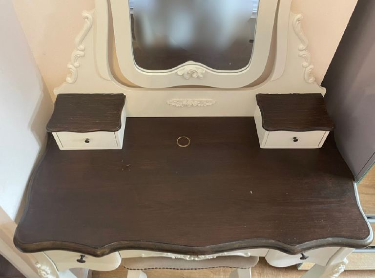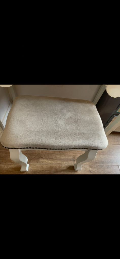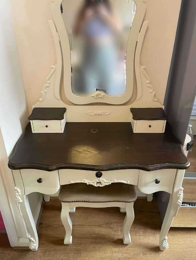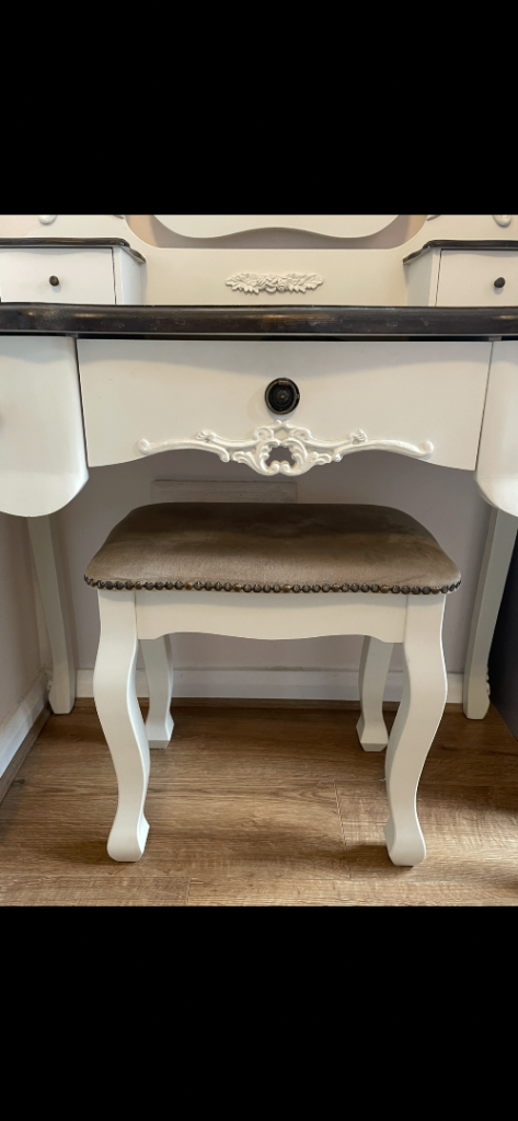 This is a handcrafted antique French style dressing table made to look shabby chic. This item was bought brand new and sadly has not being used other than the chair and to put stuff on the table top. As you can see on the pictures there is one ring mark where some wood paint has come off and a slight mark next to it (This can be easily repaired)