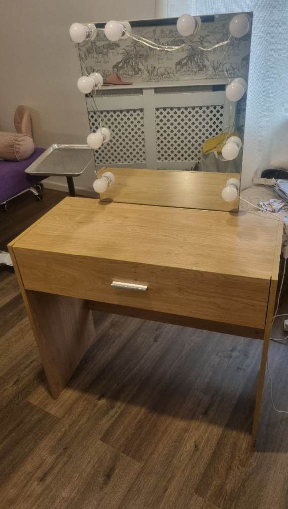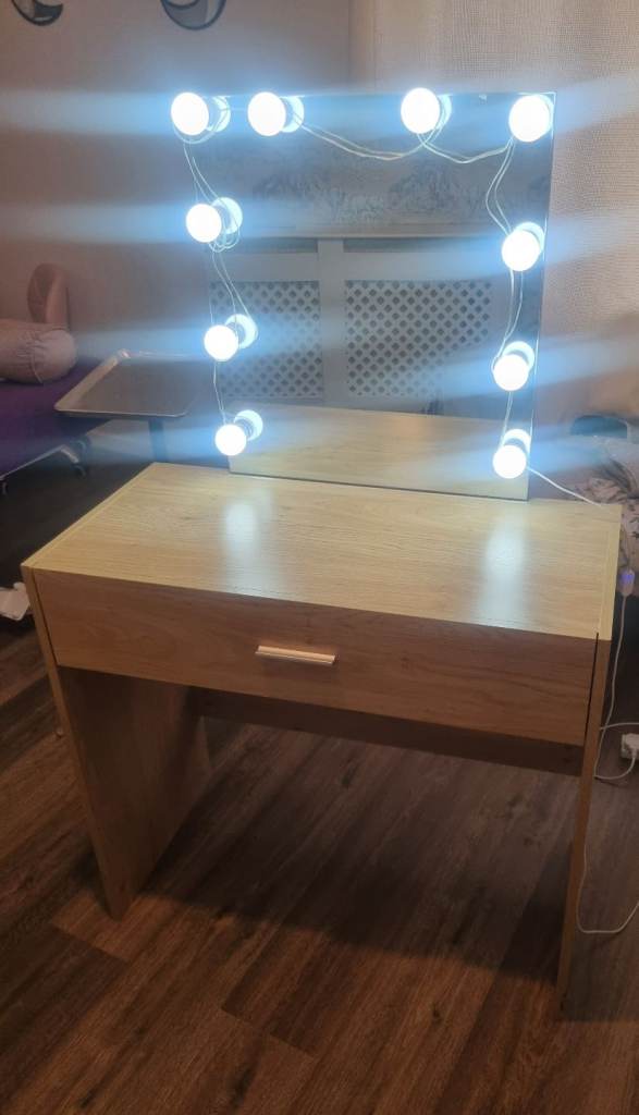 Great condition dressing table with pull out drawer for storing make up or accessories, large mirror , lights have been added and working with USB style plug . Collection only