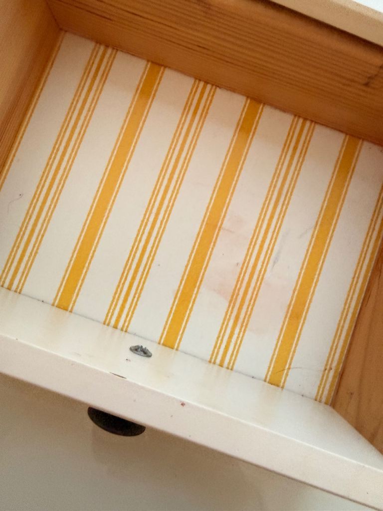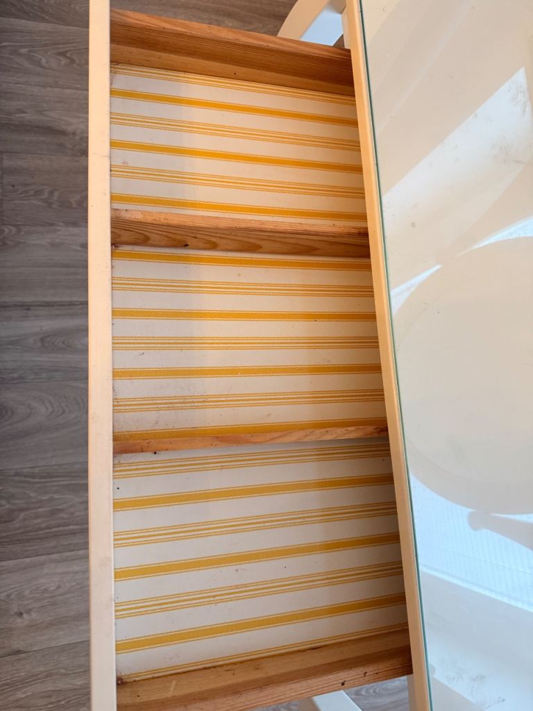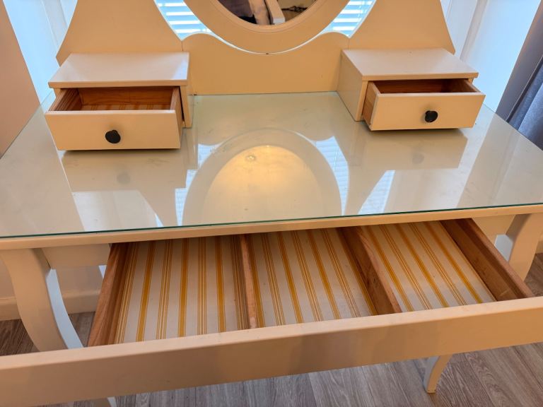 Good condition with some make up marks in the drawers and a chip on one of the legs (this could be moved to the back so not noticeable)