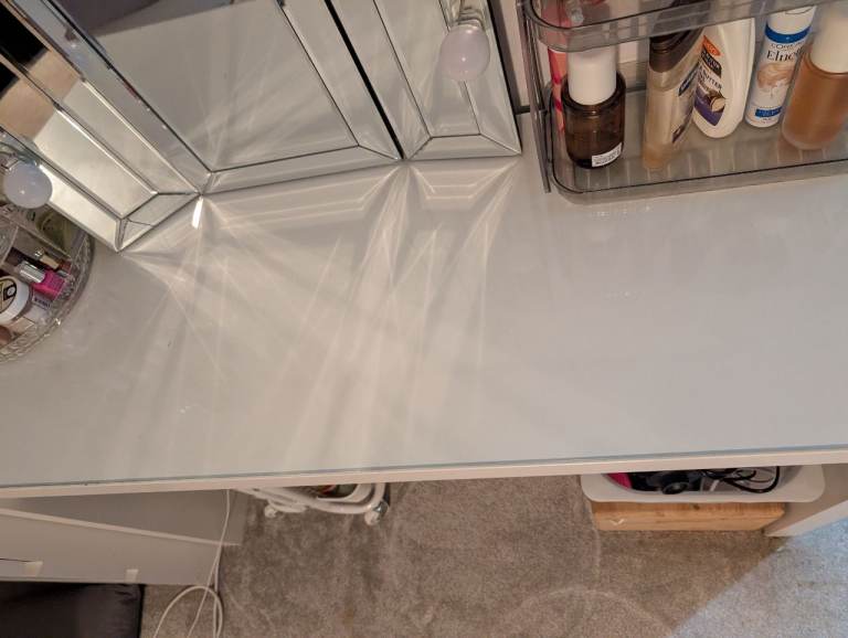 White dressing table in good condition with glass top surface. Clean, modern style and very sturdy.