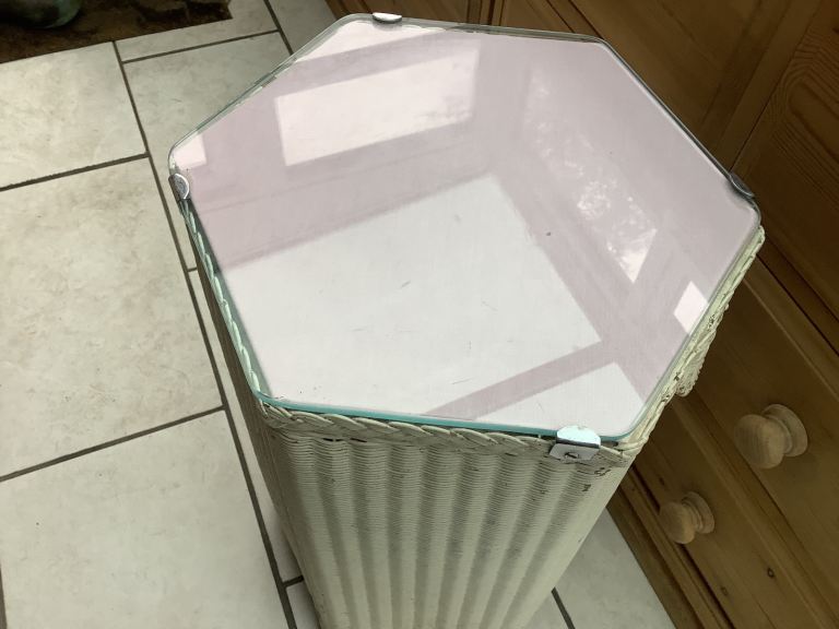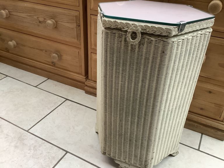 LLOYD LOOM WICKER LAUNDRY BASKET. ORIGINAL LABEL ON BASE. HEXAGON SHAPE. ALL WICKER INTACT. APPROXIMATELY 60cms TALL. WOODEN LID WITH SHAPED PIECE OF GLASS ON TOP. SITS ON 4 DECORATIVE FEET. A COAT OF PAINT WOULD FRESHEN IT UP, BUT FINE TO USE AS IS. £15 COLLECTION ONLY.