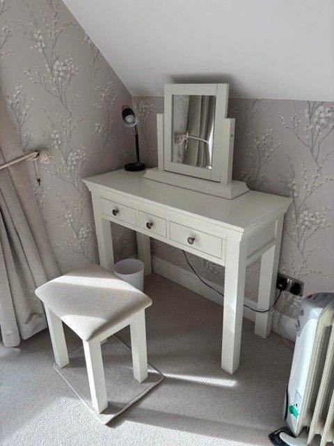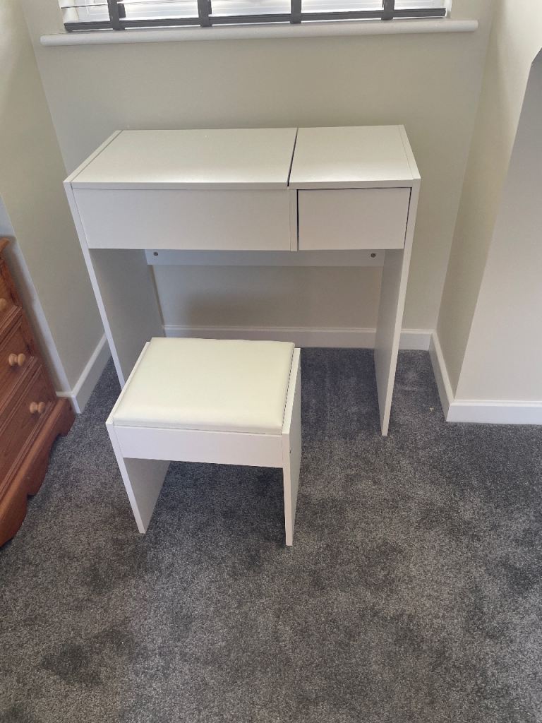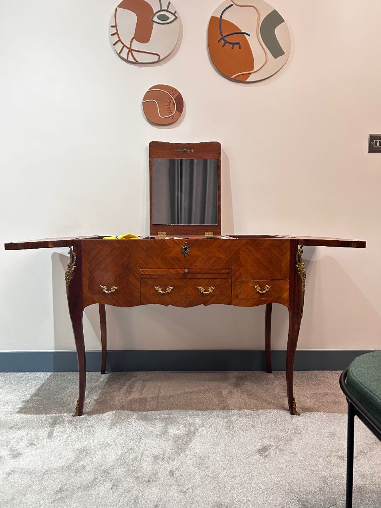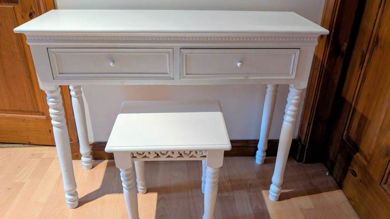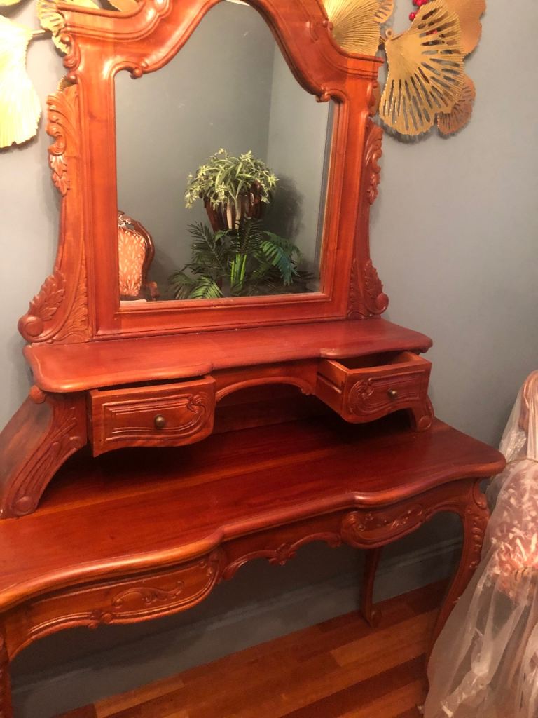 This is a solid ornate mahogany dressing table in excellent condition mirror has two small drawers and ornate carving all around it legs are also scrolled and carved and lovely feet it can also be used as a console table and separate mirror