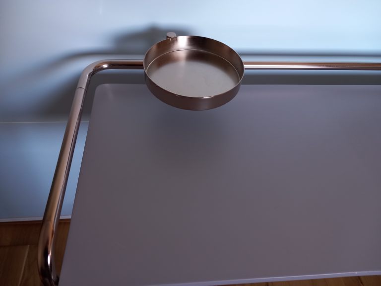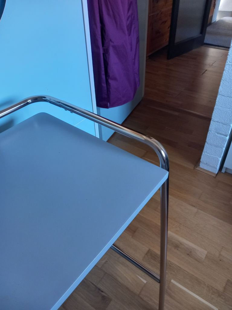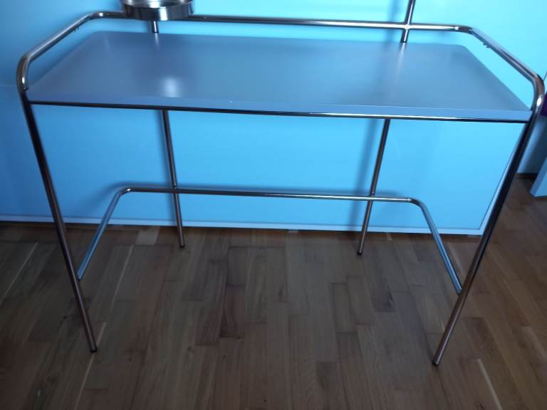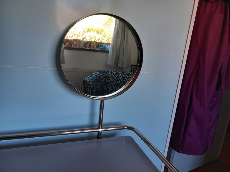 This modern take on a dressing table will enhance any room. Frame is made from rose gold COLOURED tubing. The frame will also reflect colours in the room , so it is easy to coordinate with decor. Mirror can be angled, and trinket dish can rotate. The dresser top is made from mdf and painted grey at manufacture. The dresser is in immaculate condition and was placed in a guest room so it has had minimal use. Change of use of the room forces sale.