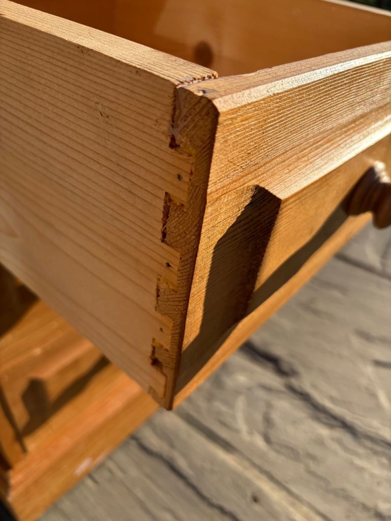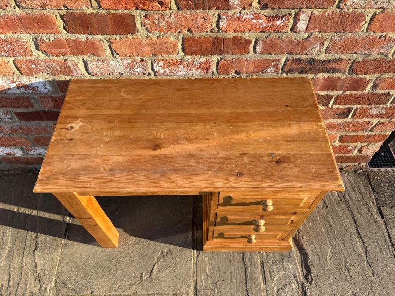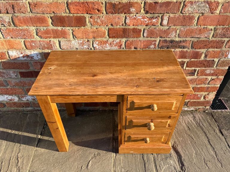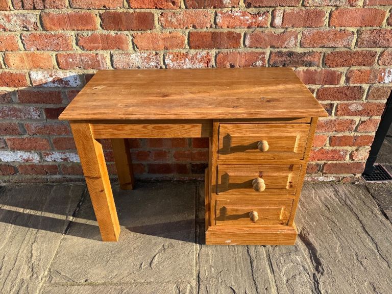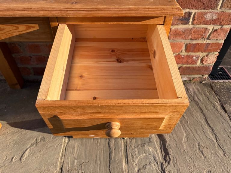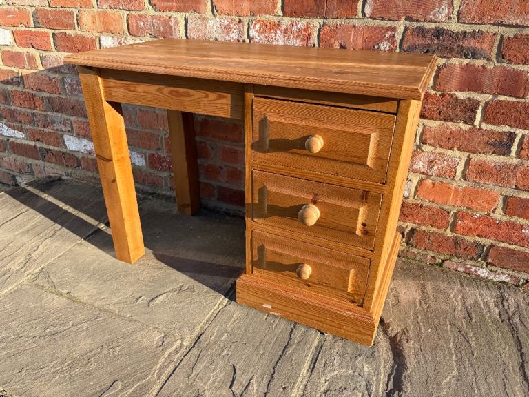 This is a lovely solid pine dressing table in good, clean condition. Constructed from 100% solid pine wood, this dressing table would be perfect in a bedroom or in an office space as a desk. Featuring a large surface space on top as well as a 41cm gap between the legs for a stool. Moreover, 3 deep drawers made with traditional dovetail joints for extra strength. There are a few marks here and there so would benefit from a little tlc. Cost £470 new.