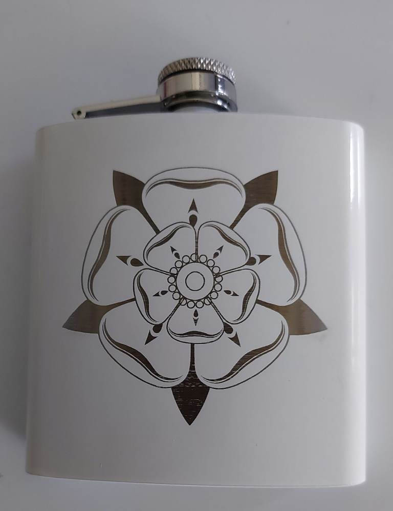 Jacobite / Yorkshire Rose White 6oz Engraved Hip Flask Set.