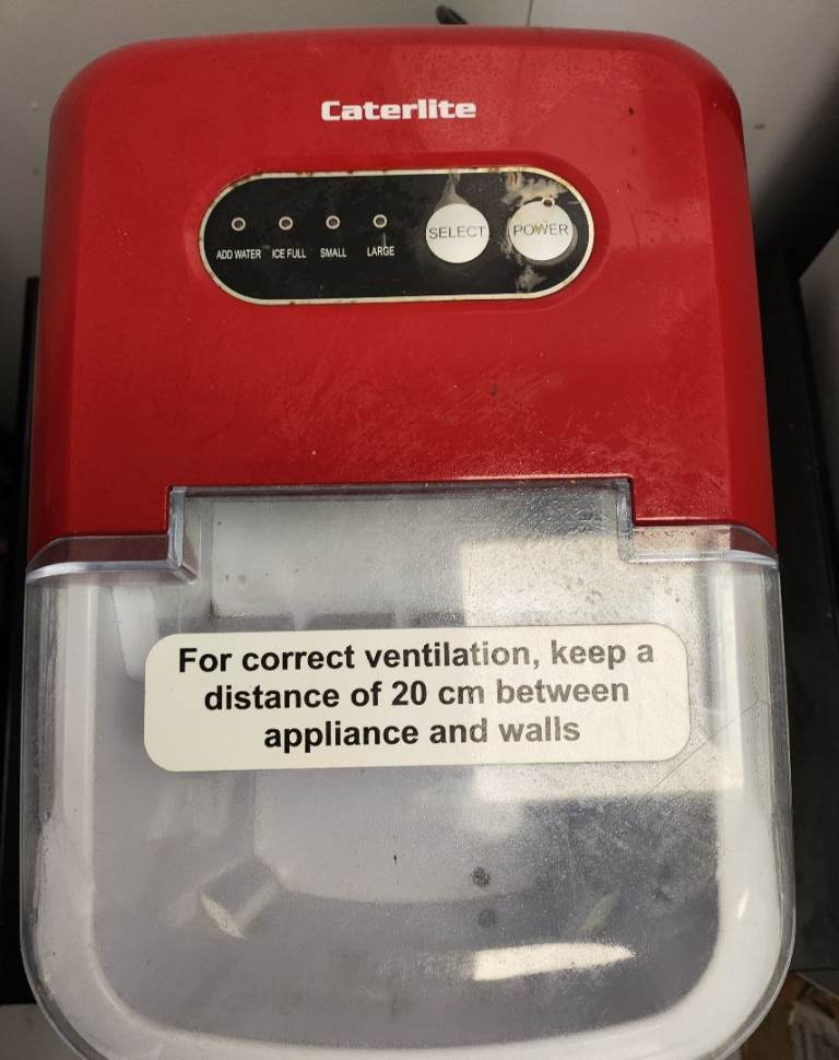 Features indicator lights for add water, ice full, and ice size selection (small / large).