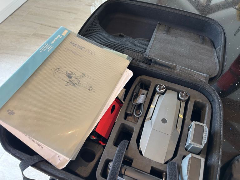 DJI Mavic Pro 1 fly more combo with DJI goggles, which allows you to fly as if you were in the drone. Large case extra blades, Landing pad. Purchased to start a hobby but only used twice, so good as new. Price for job lot. Drone cost £999 and Goggles £499 new. drone ideal for someone starting who wants good kit. Will not post due to bad experience.