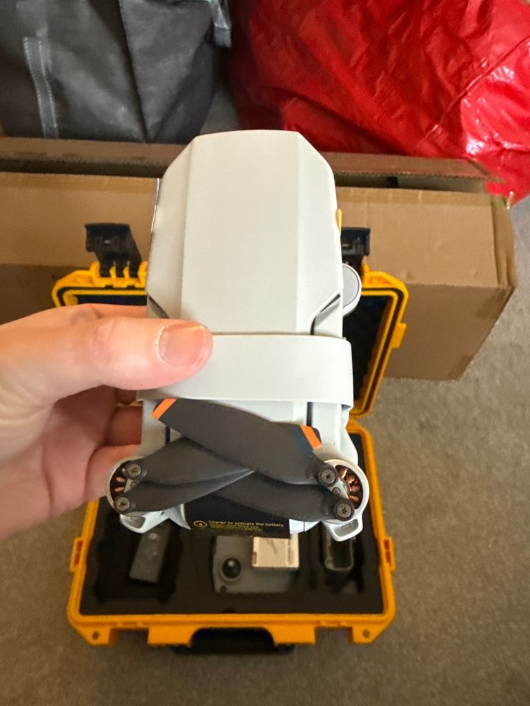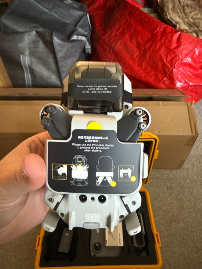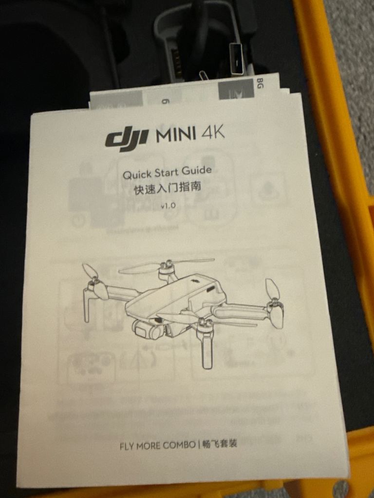 DJI Mini 4K Drone, complete with carry case, landing gear, 3 batteries, battery charging case and charging cables.