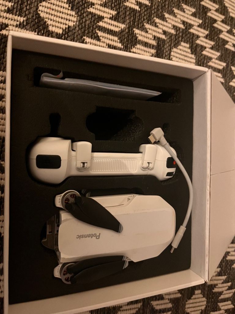 In great condition, it is great for Christmas present. Comes with instructions controller and drone and original cable