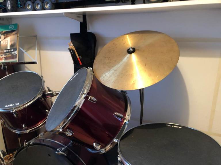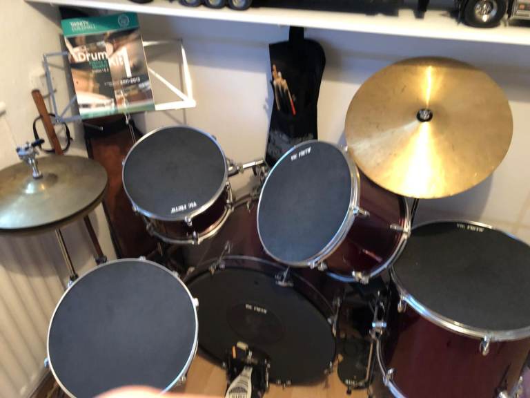 - 5 Drums including - snare and bass with foot pedal, cymbal, high hat.