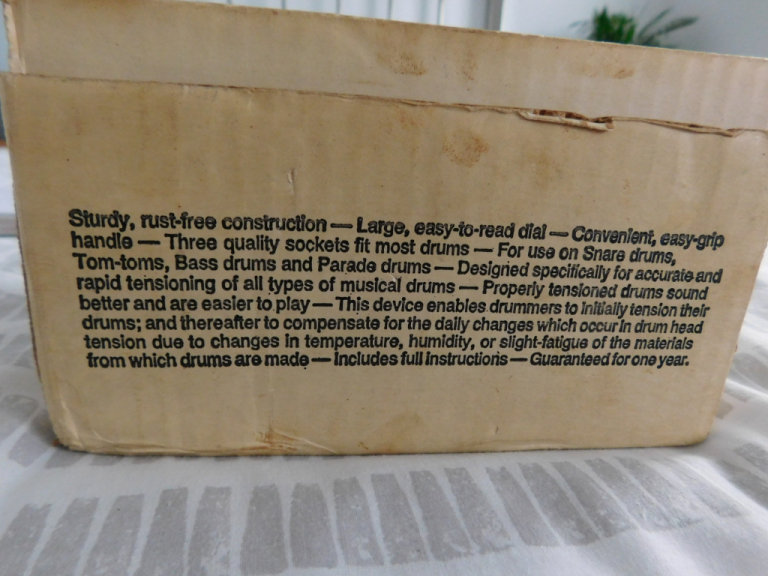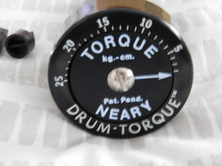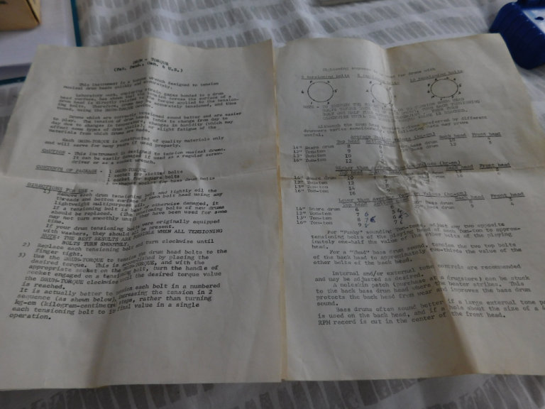 TORQUE TESTER FOR DRUMS. IT HAS 2 ATTCHMENTS FOR SLOTTED TENSION RODS - PREMIER AND SONOR - AND ONE FOR BASS DRUM T-RODS. IT IS MISSING THE SQUARE HEADED ATTACHMENT. ORIGINAL INSTRUCTIONS AND ORIGINAL BOX.