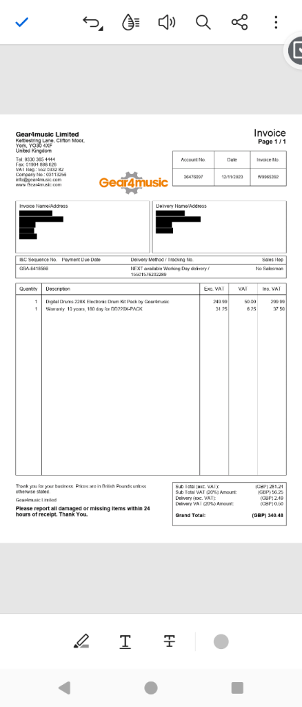 Gear4music DD220X Electronic Drum Kit, purchased November 2023.