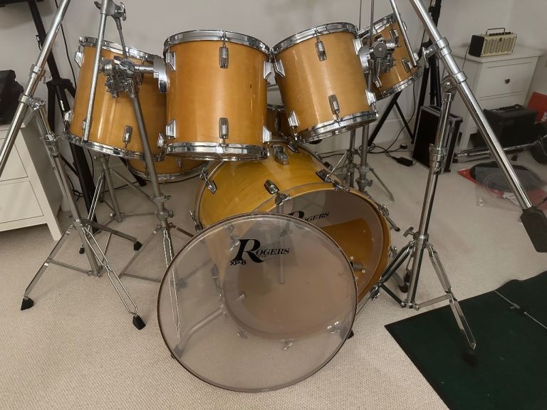 Bought new by me in 1981 my Roger’s XP8 natural maple shell drum kit. One of the last Roger’s kits to be produced in America and renowned for its heavy duty hardware and drum quality.