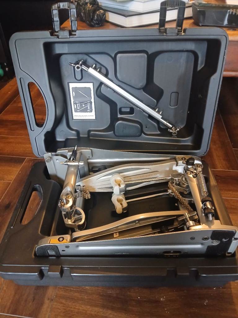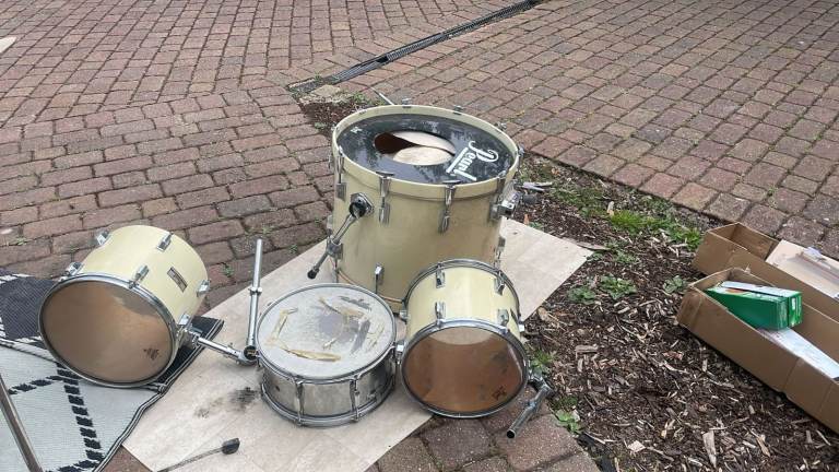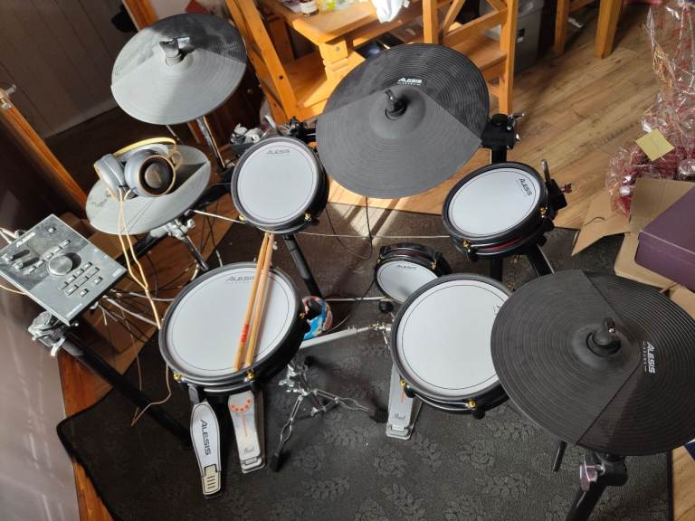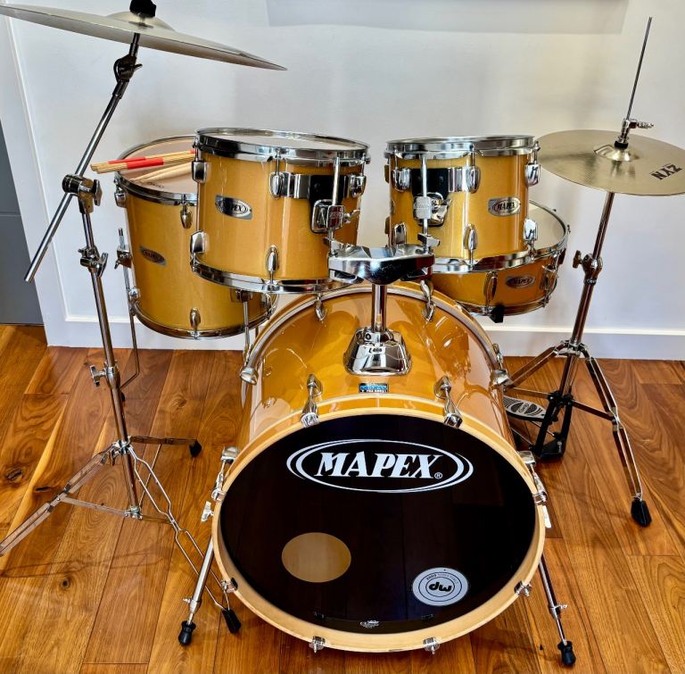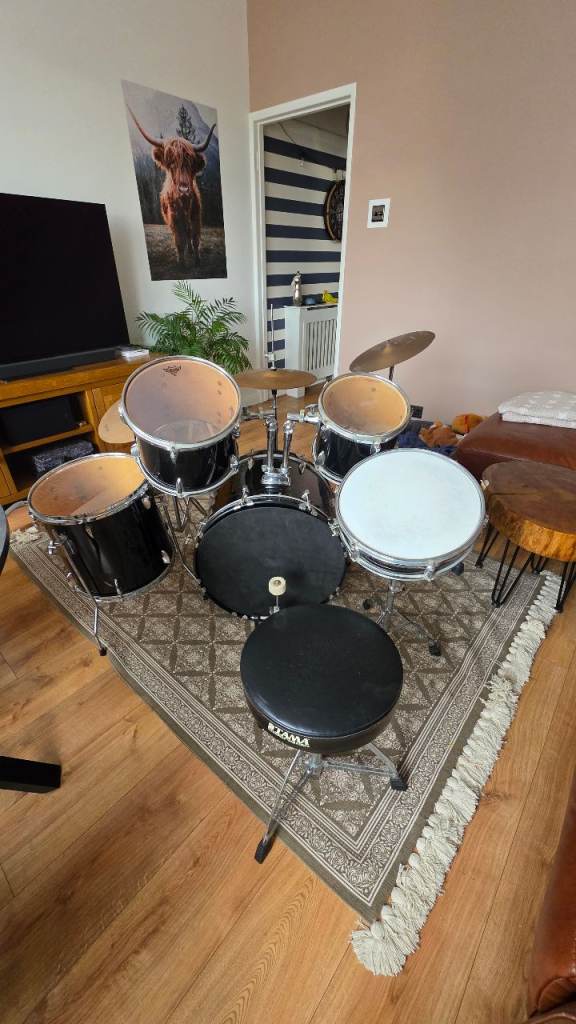 Around two years old; no dents, but a little rust on the cymbal stands which doesn't affect their sound. Everything works good.