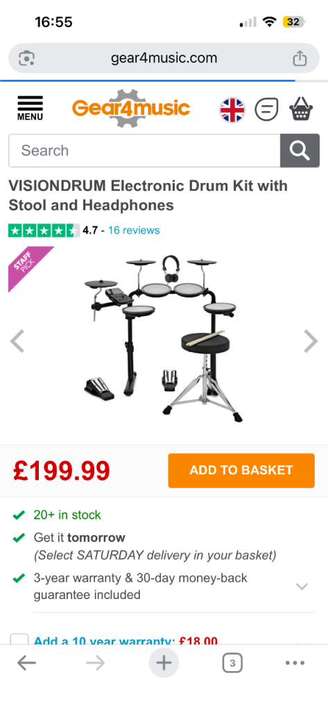 Comes with stool and headphones - also including upgraded sticks and a nonslip mat to go underneath the drum kit.