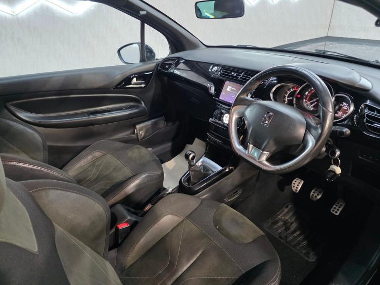 16” blade black diamond-cut alloy wheels, chrome DS grille, chrome rear bumper insert, chrome side rubbing strips, LED daytime running lights, LED front fog lights, 3D LED rear lights, dark tinted rear windows, painted roof-colour door mirrors, single chrome exhaust tailpipe, locking wheel bolts and satin chrome door sill protectors. Automatic air conditioning, sports seats with height-adjustable driver and front passenger seats, leather steering wheel, aluminium sports pedals, gloss black centre console and dashboard trim, ambient and mood lighting, soft-touch upper dashboard, front and rear split-folding seats, boot lighting, front armrest storage, integrated air freshener and multiple interior chrome and satin chrome accents. 7” colour touchscreen, DAB digital radio, Bluetooth handsfree and media streaming, USB & AUX inputs, 12V cabin socket, DS Connect Box emergency and assistance system, rear parking sensors, cruise control with speed limiter, trip computer, ABS with EBD and emergency brake assist, ESC, traction control, hill start assist, tyre pressure monitoring system, ISOFIX rear points, multiple airbags, alarm, immobiliser and remote central locking with deadlocks.