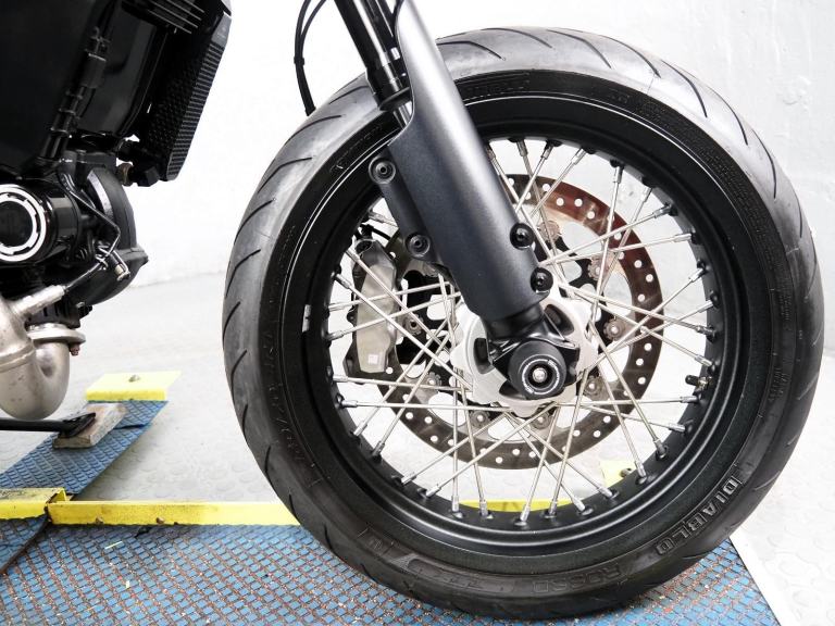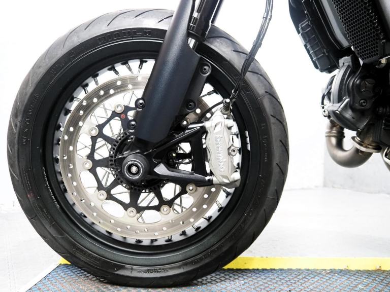 The Urban Motard is the most agile 800cc Scrambler in the lineup, featuring 17-inch spoked wheels, Pirelli Diablo Rosso III tires, and that unmistakable supermoto-inspired high front mudguard.