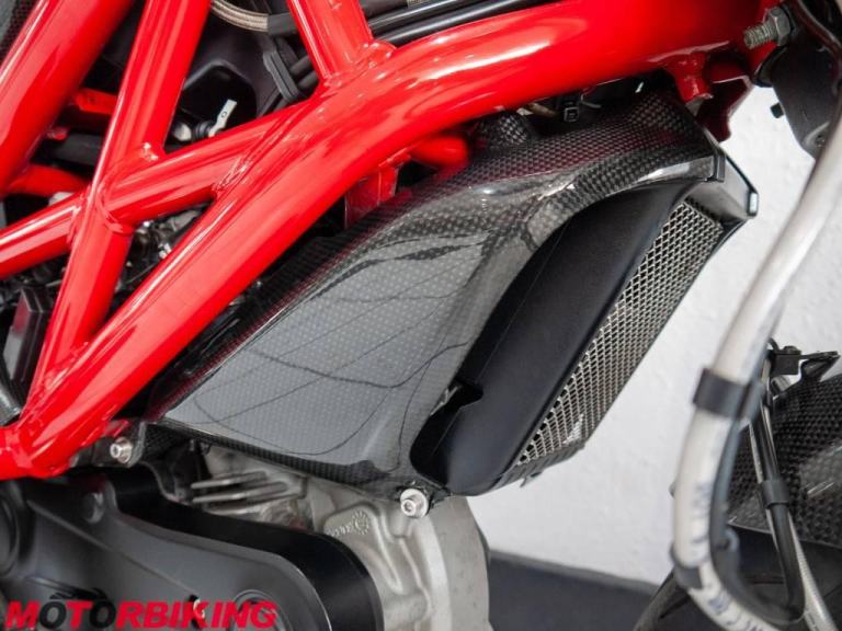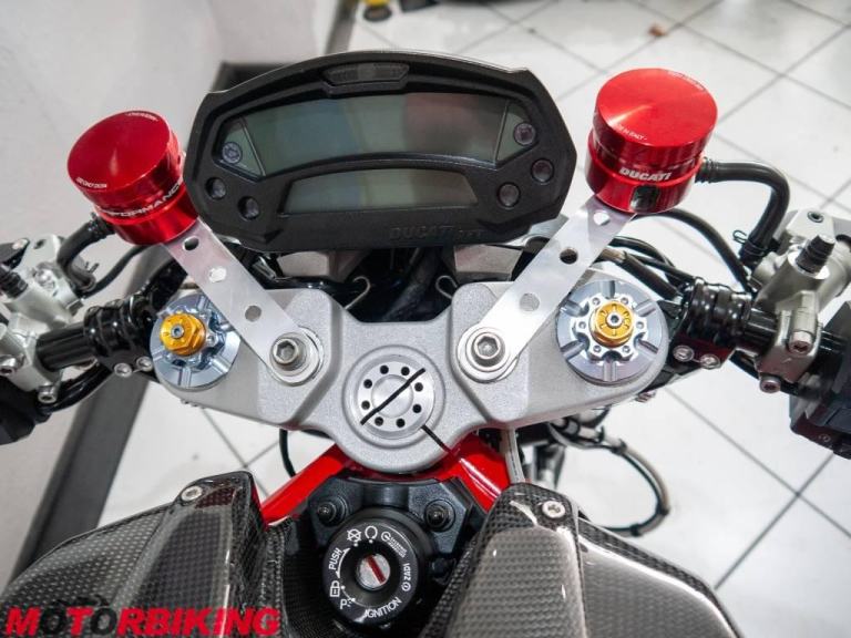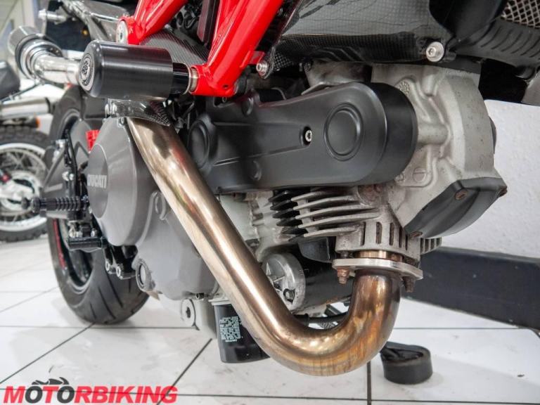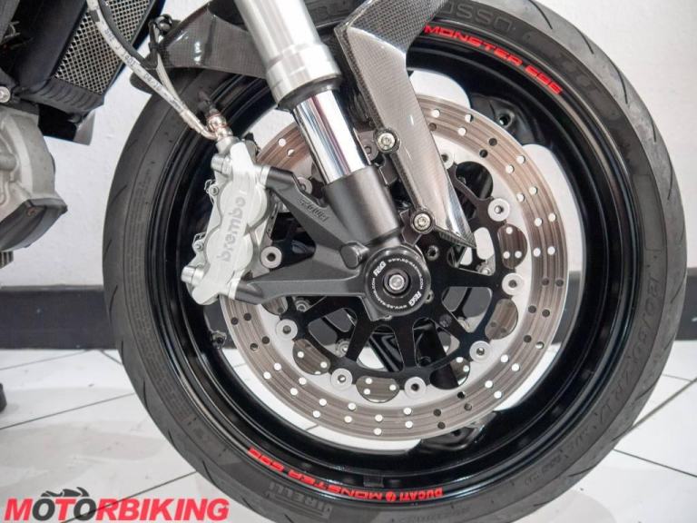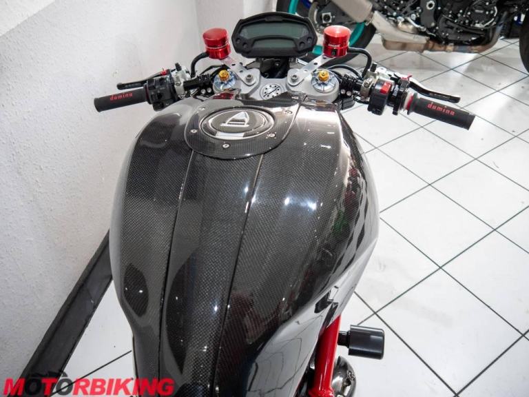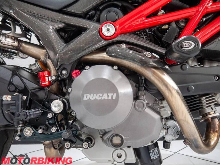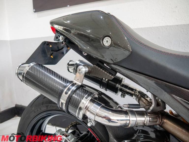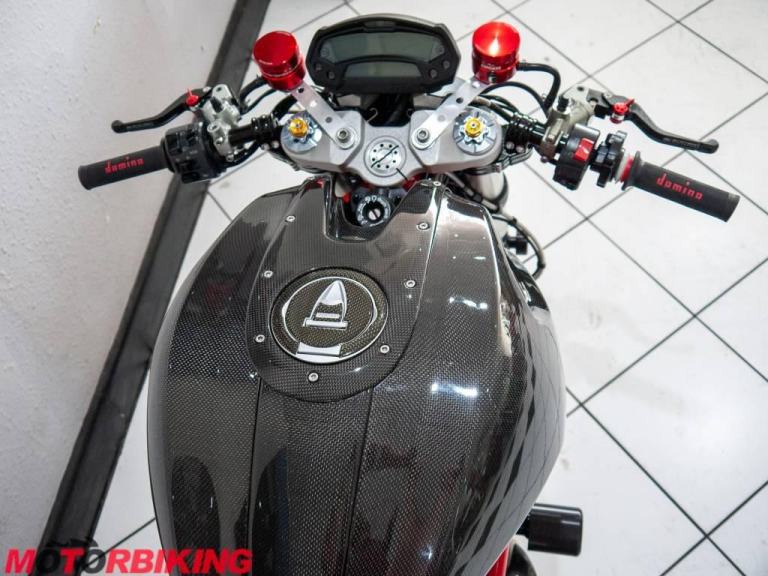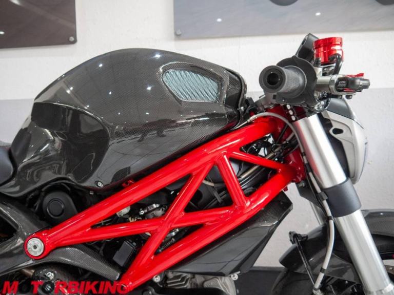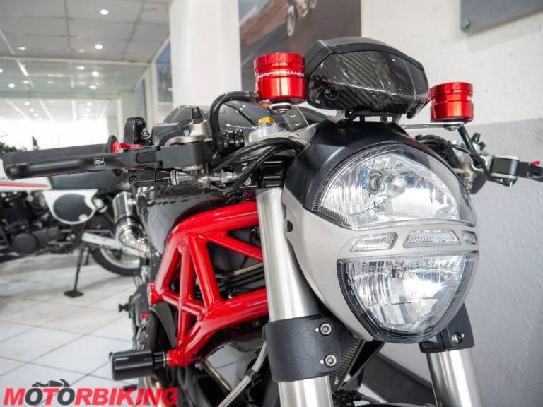 This 696 Monster is rather unique, with Cafe Racer style clip on bars and dressed in full carbon fibre bodywork it really does look the part. And, it does not stop there.
