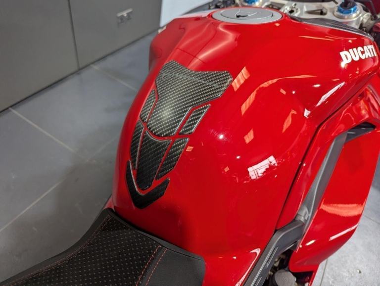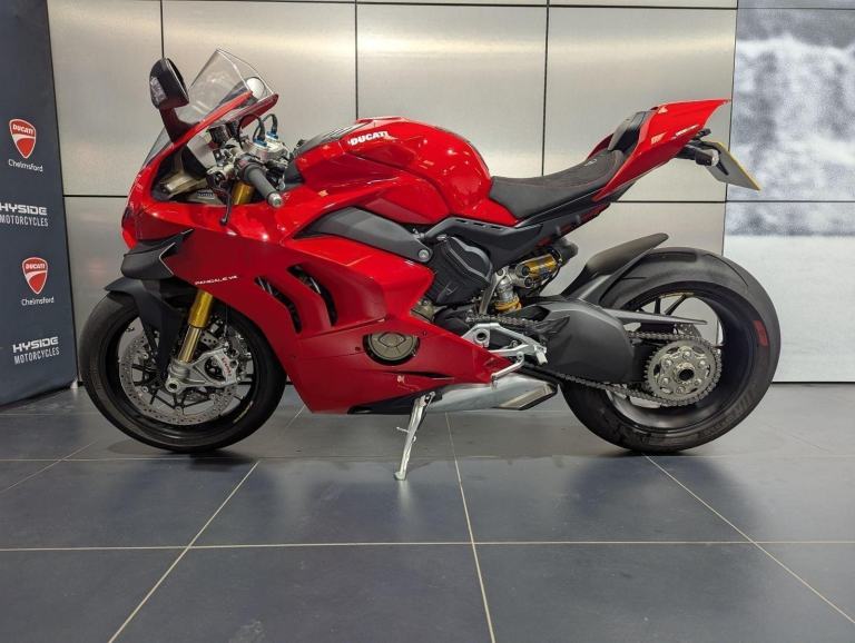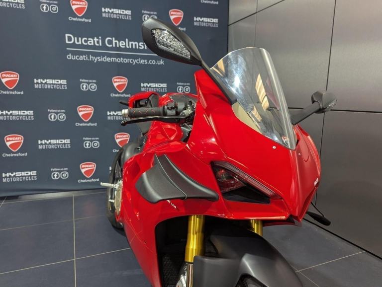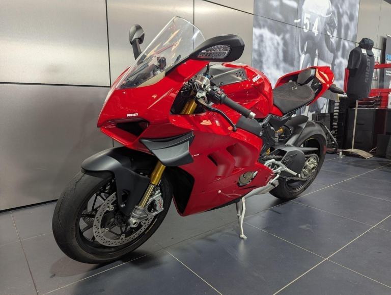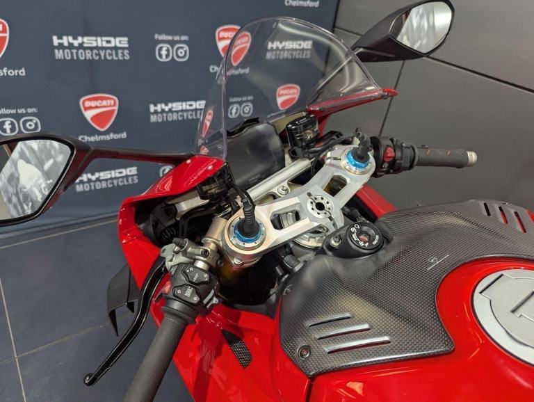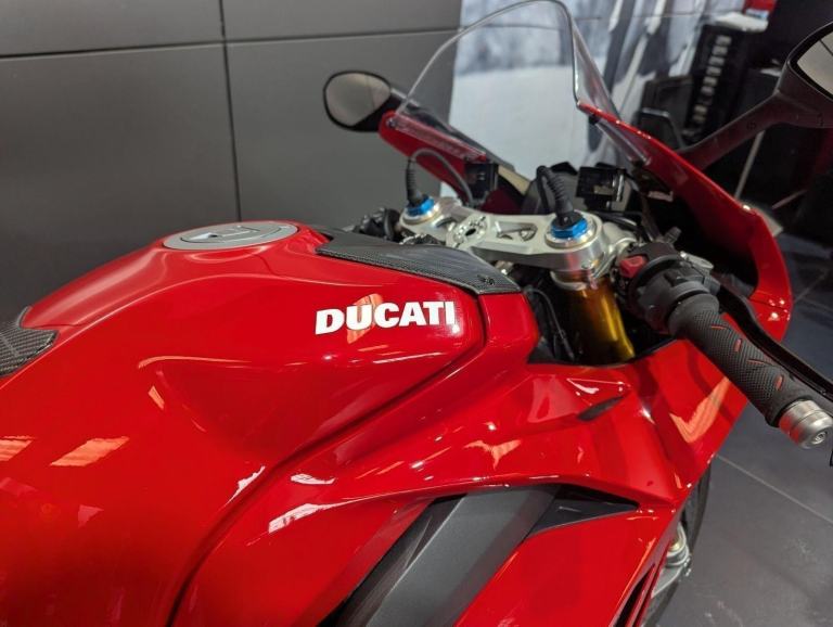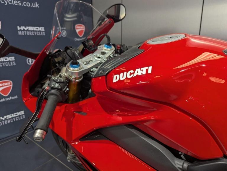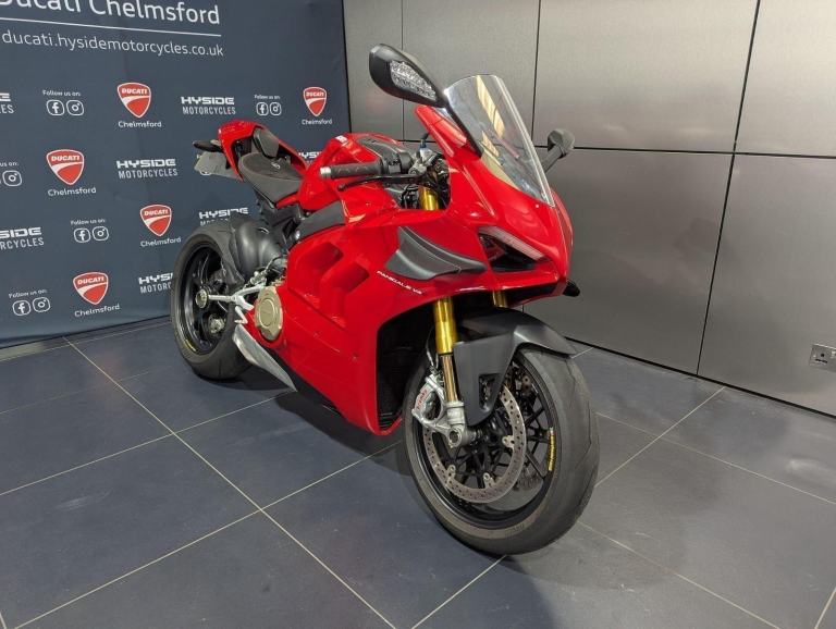 ? 2021 Panigale V4 S | Loaded ?? Price: £19,595? 2021 | 1 Owner | 9,178 Miles? Performance & Carbon Upgrades? Stunning Example ? Must SeeThis 2021 Ducati Panigale V4 S is a beautifully presented, single-owner superbike with 9,178 miles, packed with high-quality upgrades and finished to an exceptional standard. A premium example of Ducati?s flagship V4 S, this bike blends cutting-edge performance with tasteful custom detailing.Upgrades include:? Ducati Performance seat? Carbon fibre tank cover? Carbon fibre heel guards? Tail tidy? Rizoma reservoir pots? Evotech rear tank protection? Evotech radiator and oil cooler guardsWith the Öhlins electronic suspension, Brembo Stylema brakes, and MotoGP-derived Desmosedici Stradale V4 engine, this V4 S offers immense capability for both road and track ? made even better with the protection and cosmetic upgrades fitted.? Key Features:1,103cc Desmosedici Stradale V4 ? 214 hpÖhlins Smart EC 2.0 semi-active suspensionBrembo Stylema monobloc brakes6-axis IMU with cornering ABS, traction control, slide & wheelie controlSingle-sided swingarm & TFT dash1 owner from new | 9,178 milesTasteful upgrades and protection parts fitted? Why Buy This Bike?Highly maintained, fully loaded exampleTasteful carbon, Rizoma, and Evotech additionsDesirable 1-owner bikeIncredible value at £19,595Turn-key ready for summer riding or track use? Ducati Chelmsford? 01708 763360? Nationwide Delivery | ? Finance AvailableCall now to secure this stunning Panigale V4 S.Rare to find one this clean, this well-specced, and this well-priced., 1 owners, 2 keys, ABS, Belly Pan, Electric start, LED Indicators, Rear Hugger, Screen, Seat Cowl, Tail Tidy, Tank Pad, Traction Control, Contact us for the best deals on all new Ducati models call now 01708 706677
