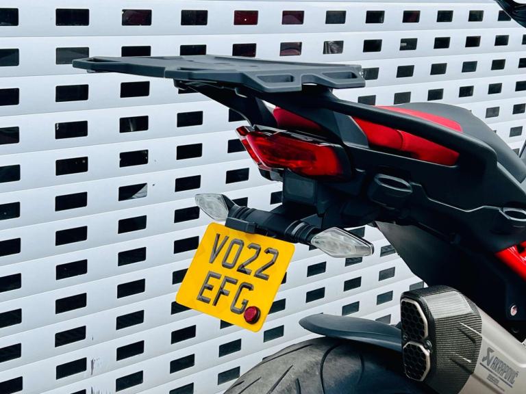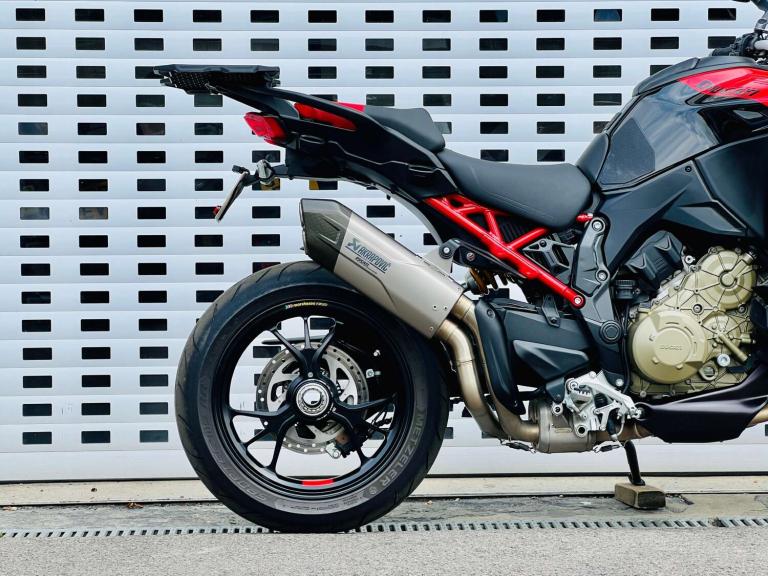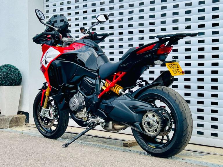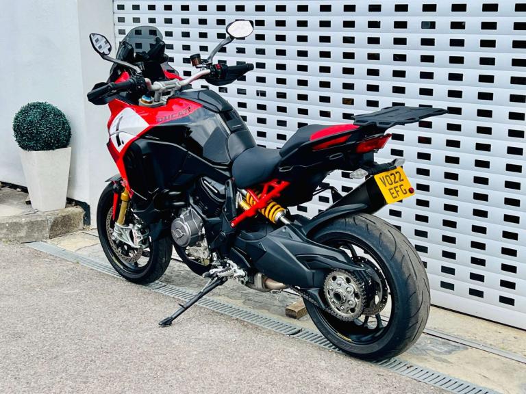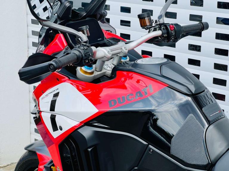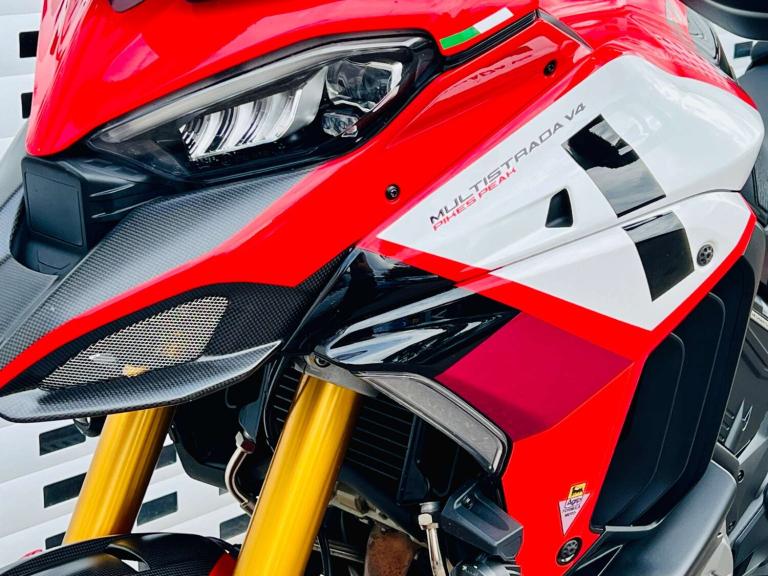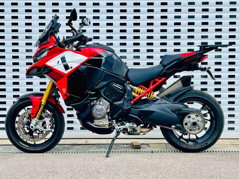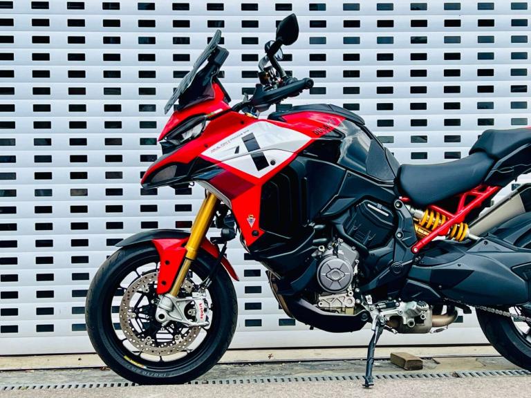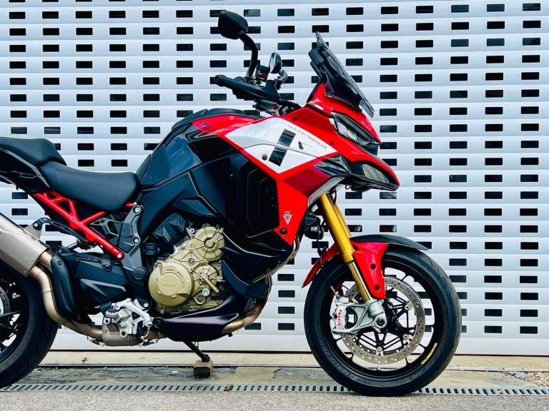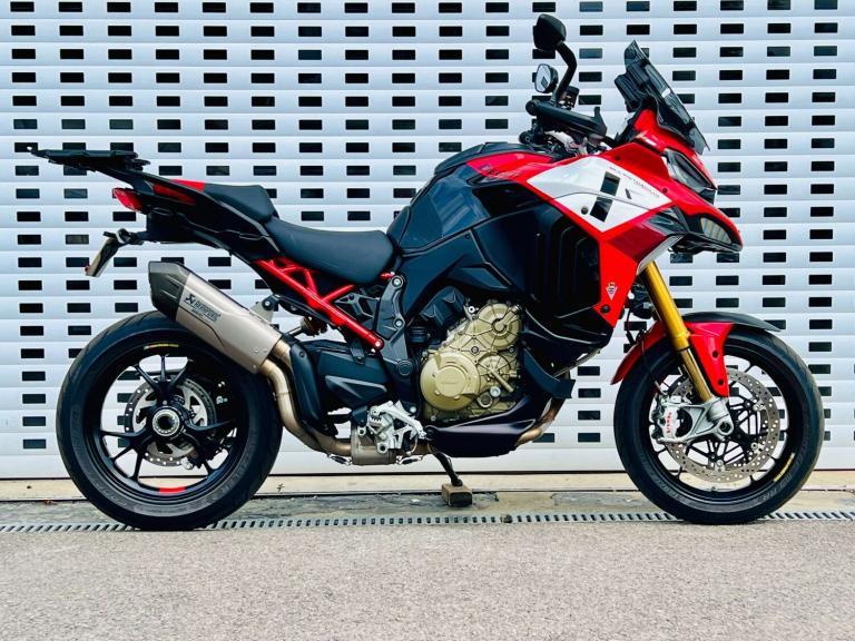 +++ JUST FURTHER REDUCED! +++ STUNNING DUCATI MULTISTRADA V4 PIKES PEAK IN GORGEOUS DUCATI RED WHITE & BLACK COLOUR SCHEME. THE RACE LIVERY MAKES NO HIDING THE EXTREME SPORTING INTENTION & RIDE QUALITY OF THIS BIKE. HOWEVER THE UPRIGHT RIDING POSITION LENDS BRILLIANTLY TO THE REQUIREMENTS OF THE MODERN DAY RIDER OR LONG DISTANCE TOURER. THE VERY HIGH SPEC INCLUDES; AKRAPOVIC CARBON TIP SILENCER, SPORTS FRONT PIPES WITH DEDICATED MAPPING, Öhlins Smart-EC 2.0 Electronically Adjustable suspension, Adaptive Cruise control, blind spot monitoring, a suite of Riding modes with road sport orientation unique to this and the RS model, Lovely two-tone Red/black seat, High end Brembo brakes, 17"" Front wheel to add to the precise handling character, Forged aluminium Marchesini wheels shod with Pirelli Diablo Rosso road tires, adjustable smoked windscreen, multiple safety rider aids inc Ducati Wheelie Control and lean-sensitive traction control, single-sided swingarm, heated grips. Exhaust hanger plus original pillion pegs and mainstand included also.++ WE WILL CONSIDER ANY PART EXCHANGE UP OR DOWN CAR OR BIKE AND CAN OFFER COMPETITIVE LOW DEPOSIT FINANCE WITH PCP OPTIONS. ++UK DELIVERY OPTIONS AT REASONABLE RATES ++Please note: We can accept payments of up to £500 on a debit card. Any larger amount will need to be paid via BACS (bank transfer). If you wish to pay on collection please check processing times as we are unable to release cars without cleared funds. Be sure to bring anything required to make larger payments such as card readers. We take great care in making sure our adverts and specifications are listed accurately but please check for confirmation as human and system errors can occasionally occur.